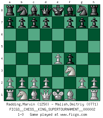 Last move : 1-0 2018 June 2 12:44:50 [Event "FICGS__CHESS__KING_SUPERTOURNAMENT__000002"] [Site "FICGS"] [Date "2018.05.01"] [Round "1"] [White "Radding,Marvin"] [Black "Malish,Dmitriy"] [Result "1-0"] [WhiteElo "1250"] [BlackElo "0771"] 1.e4 e5 2.f4 exf4 3.Nf3 1-0 This chess game has been lost on time (started : 2018.05.01 22:10:15) King's knight's gambit Player White won this chess game. Follow this game move after move (download)He who fears an isolated Queen's Pawn should give up Chess. (Siegbert Tarrasch) Um sich vor der Gefahr einer Erkältung zu schützen, sorge der wanderlustige König beizeiten für ein brauchbares Versteck. (Aaron Nimzowitsch) Tu cuerpo tiene que estar en óptima condición. Tu Ajedrez se deteriora como lo hace tu cuerpo. No puedes separar la mente y el cuerpo. (Bobby Fischer) L'ordinateur a tué l'originalité. Il n'y a plus guère d'aventures sur l'échiquier. (Jacob Murray) The good fighters of old first put themselves beyond the possibility of defeat, and then waited for an opportunity of defeating the enemy. (Sun Tzu)