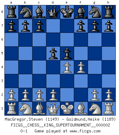 Last move : 0-1 2018 June 2 0:45:32 [Event "FICGS__CHESS__KING_SUPERTOURNAMENT__000002"] [Site "FICGS"] [Date "2018.05.01"] [Round "1"] [White "MacGregor,Steven"] [Black "Goldmund,Heike"] [Result "0-1"] [WhiteElo "1149"] [BlackElo "1189"] 1.e4 e5 2.f4 d5 0-1 This chess game has been lost on time (started : 2018.05.01 22:10:15) KGD : Falkbeer counter-gambit Player Black won this chess game. Follow this game move after move (download)An attack on the wing should be met by play in the center. (Nimzovitch) Vielleicht wirkt die Aura früherer Spieler glanzvoller als die der heutigen Spieler, aber das liegt daran, dass man kein Programm wie Fritz hatte, das einem all die Löcher in ihren Partien zeigt. (Vladimir Kramnik) Después de una mala apertura, hay una esperanza en el juego medio. Pero una vez que estas en finales, el momento de la verdad ha llegado. (Edmar Mednis) 'L'échange des dames est un coup dur pour les deux adversaires...' Un journaliste lors d'une partie du match Spassky-Fischer SEO proverb : Make your website optimized for human beings, not for search engines.