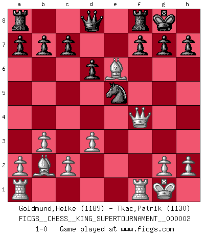 Last move : 1-0 2018 June 17 3:10:33 [Event "FICGS__CHESS__KING_SUPERTOURNAMENT__000002"] [Site "FICGS"] [Date "2018.05.01"] [Round "1"] [White "Goldmund,Heike"] [Black "Tkac,Patrik"] [Result "1-0"] [WhiteElo "1189"] [BlackElo "1130"] 1.e4 e5 2.f4 exf4 3.Nf3 Bb4 4.Bc4 Nf6 5.b3 Nxe4 6.Bb2 O-O 7.O-O Nc6 8.d3 d6 9.Nbd2 Bxd2 10.Nxd2 Nxd2 11.Qxd2 Ne5 12.Qxf4 Be6 13.Bxe6 1-0 This chess game has been lost on time (started : 2018.05.01 22:10:15) King's knight's gambit Kingside Castling by player Black (move 6) Kingside Castling by player White (move 7) Player White won this chess game. Follow this game move after move (download)Fischer is completely natural. He plays no roles. He's like a child. Very, very simple. (Zita Rajcsanyi) Heutzutage gewinnt im Turnier nicht derjenige Spieler, der weitreichende Pläne entwirft, sondern einfach jener, der Zug um Zug kämpft. (David Bronstein) Si el ingenio solamente fuese necesario para lucirse, las mujeres serían las mejores jugadoras de Ajedrez del mundo. (Albin) Les échecs, c'est l'imagination. (David Bronstein) The existence of forgetting has never been proved: We only know that some things don't come to mind when we want them. (Friedrich Nietzsche)