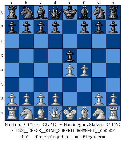 Last move : 1-0 2018 June 1 0:38:7 [Event "FICGS__CHESS__KING_SUPERTOURNAMENT__000002"] [Site "FICGS"] [Date "2018.05.01"] [Round "1"] [White "Malish,Dmitriy"] [Black "MacGregor,Steven"] [Result "1-0"] [WhiteElo "0771"] [BlackElo "1149"] 1.e4 e5 2.f4 1-0 This chess game has been lost on time (started : 2018.05.01 22:10:15) King's gambit Player White won this chess game. Follow this game move after move (download)I prefer to lose a really good game than to win a bad one. (David Levy) Jede Eröffnung ist gut genug um gespielt zu werden, wenn nur ihr Ruf schlecht genug ist. (Savielly Grigorievitsch Tartakower) Yo he agregado estos principios a la ley: pongan los Caballos en acción antes de que los dos Alfiles sean desarrollados. (Emanuel Lasker) Un journaliste : 'Vous préférez avoir une dame de plus sur l'échiquier ou au lit ?' Boris Spassky : 'Ca dépend de la position.' You think that education is too expensive ? Try ignorance. (Derek Bok)