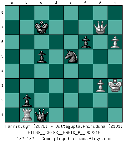 Last move : 1/2-1/2 2018 July 15 4:47:23 [Event "FICGS__CHESS__RAPID_A__000216"] [Site "FICGS"] [Date "2018.05.02"] [Round "1"] [White "Farnik,Kym"] [Black "Duttagupta,Aniruddha"] [Result "1/2-1/2"] [WhiteElo "2076"] [BlackElo "2101"] 1.Nf3 Nf6 2.d4 d5 3.c4 c6 4.Nc3 e6 5.Bg5 dxc4 6.e4 b5 7.e5 h6 8.Bh4 g5 9.Nxg5 hxg5 10.Bxg5 Nbd7 11.exf6 Bb7 12.g3 c5 13.d5 Qb6 14.Bg2 O-O-O 15.O-O b4 16.Rb1 Qa6 17.dxe6 Bxg2 18.e7 Bxf1 19.Kxf1 Bxe7 20.fxe7 Rdg8 21.Ne4 Rxg5 22.Nxg5 Re8 23.Qd5 Rxe7 24.Kg1 f6 25.Ne4 Kc7 26.Nd2 Qxa2 27.Rd1 Re5 28.Qf7 Qa4 29.Rc1 c3 30.bxc3 a5 31.Nc4 Re4 32.cxb4 axb4 33.Ne3 Qc6 34.h4 Rxe3 35.fxe3 Qd6 36.Qg6 b3 37.h5 Qd2 38.Rf1 Qxe3+ 39.Kg2 Qd2+ 40.Kh3 b2 41.Rb1 Qc1 42.h6 Ne5 43.Qg7+ 1/2-1/2 Reti Opening Queenside Castling by player Black (move 14) Kingside Castling by player White (move 15) This chess game ended in a draw. Follow this game move after move (download)A man without frontiers. He didn't divide the East and the West, he brought them together in their admiration for him. (Ljubomir Ljubojevic, about Bobby Fischer's death) Schach ist ein Teil der Kultur, und wenn es mit der Kultur abwärts geht, geht es auch mit dem Schach abwärts. (Mikhail Moiseyevich Botvinik) La vida es como el Ajedrez, con lucha, competición y eventos buenos y malos. (Benjamin Franklin) Les échecs, c'est l'imagination. (David Bronstein) If computers get too powerful, we can organize them into committees. That'll do them in. (Anonymous)