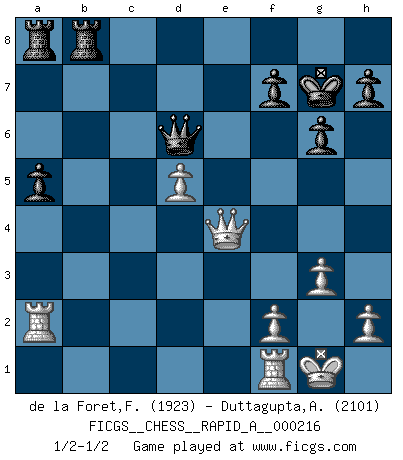 Last move : 1/2-1/2 2018 August 5 19:27:24 [Event "FICGS__CHESS__RAPID_A__000216"] [Site "FICGS"] [Date "2018.05.02"] [Round "1"] [White "de la Foret,Fred"] [Black "Duttagupta,Aniruddha"] [Result "1/2-1/2"] [WhiteElo "1923"] [BlackElo "2101"] 1.d4 Nf6 2.c4 g6 3.Nc3 d5 4.cxd5 Nxd5 5.e4 Nxc3 6.bxc3 Bg7 7.Be3 c5 8.Nf3 Qa5 9.Bd2 O-O 10.Be2 Bg4 11.O-O Rd8 12.Rb1 cxd4 13.cxd4 Qxa2 14.Ra1 Qb2 15.Rb1 Qa2 16.d5 Nd7 17.Rxb7 Nc5 18.Rb4 a5 19.Rc4 Nb3 20.Bg5 Bf6 21.Bxf6 exf6 22.Rc2 Qa3 23.Nd4 Bxe2 24.Rxe2 Nxd4 25.Qxd4 Kg7 26.g3 Rdb8 27.e5 Qf3 28.Ra2 fxe5 29.Qxe5+ Qf6 30.Qe4 Qd6 1/2-1/2 King's Indian defense, 3.Nc3 Kingside Castling by player Black (move 9) Kingside Castling by player White (move 11) This chess game ended in a draw. Follow this game move after move (download)No one ever won a game by resigning. (Unknown) Ich bin Weltmeister und muß mit niemandem irgend etwas diskutieren. (Viswanathan Anand) El Ajedrez es un terrible juego. Si no controlas el centro, tu oponente tiene una posición mas holgada. Si tienes control del centro, ¡entonces realmente tu tienes algo de que preocuparte!. (Siegbert Tarrasch) Ce n'est pas pour s'amuser qu'il joue aux échecs : il célèbre un culte. (Vladimir Nabokov) I couldn't make any sense out of what this particular thread is about. It sounds like R2 D2 computer speaking. A space fight ?!? Some 'command' problems in Moscow ? Some killers & narcotic addicts attacking some game & a god wannabe ?? (Dinesh De Silva, lost in a russian conflict in FICGS forum)