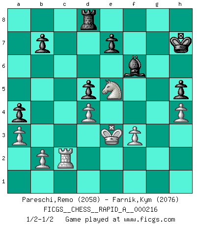 Last move : 1/2-1/2 2018 May 22 16:44:16 [Event "FICGS__CHESS__RAPID_A__000216"] [Site "FICGS"] [Date "2018.05.02"] [Round "1"] [White "Pareschi,Remo"] [Black "Farnik,Kym"] [Result "1/2-1/2"] [WhiteElo "2058"] [BlackElo "2076"] 1.d4 Nf6 2.c4 g6 3.Nc3 d5 4.Nf3 Bg7 5.h4 c6 6.cxd5 cxd5 7.Bf4 O-O 8.e3 Nc6 9.Be2 Bg4 10.Qb3 Qc8 11.Rc1 Rd8 12.Ne5 Bxe2 13.Nxe2 Nh5 14.f3 Nxf4 15.exf4 h5 16.Kf2 Qe6 17.Rc5 a5 18.a3 a4 19.Qc2 Rdc8 20.Rc1 Bf6 21.g3 Qh3 22.f5 Qh2+ 23.Ke3 Kg7 24.Nf4 Qxg3 25.fxg6 fxg6 26.Qxg6+ Qxg6 27.Nfxg6 Nxe5 28.Nxe5 Rxc5 29.Rxc5 Rd8 30.Rc2 Kh7 1/2-1/2 King's Indian defense, 3.Nc3 Kingside Castling by player Black (move 7) This chess game ended in a draw. Follow this game move after move (download)Chess is life. (Bobby Fischer) Stil? Ich habe keinen Stil! (Anatoly Karpov) ¿Que sería del Ajedrez sin errores graciosos?. (Kurt Richter) Fischer est le meilleur joueur du monde et Karpov n'est qu'un joueur de bistrot. (Garry Kasparov, agé de 16 ans) There is a great deal of difference between an eager man who wants to read a book and a tired man who wants a book to read. (G.K. Chesterton)