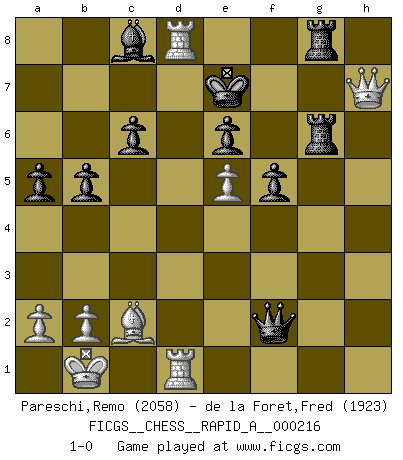 Last move : 1-0 2018 June 24 11:42:14 [Event "FICGS__CHESS__RAPID_A__000216"] [Site "FICGS"] [Date "2018.05.02"] [Round "1"] [White "Pareschi,Remo"] [Black "de la Foret,Fred"] [Result "1-0"] [WhiteElo "2058"] [BlackElo "1923"] 1.d4 Nf6 2.c4 e6 3.Nc3 d5 4.Nf3 c6 5.e3 Nbd7 6.Qc2 Bd6 7.g4 Nxg4 8.Rg1 Nxh2 9.Nxh2 Bxh2 10.Rxg7 Nf8 11.Rg2 Bc7 12.e4 Ng6 13.Bg5 f6 14.Bh6 dxc4 15.O-O-O Bf4+ 16.Bxf4 Nxf4 17.Rg7 Kf8 18.Rg3 Rg8 19.e5 f5 20.Bxc4 Ng6 21.Ne2 a5 22.Rdg1 b5 23.Bd3 Qd5 24.Qd2 Ra7 25.Kb1 R8g7 26.Qh6 Ke8 27.Bc2 Rg8 28.Nf4 Qxd4 29.Nxg6 Rag7 30.Rd1 Qxf2 31.Rgd3 Rxg6 32.Rd8+ Ke7 33.Qxh7+ 1-0 Comment by player 1 : Remo Pareschi : Thanks Fred. It is a gambit line I am very fond of -- Remo Comment by player 2 : Fred de la Foret : Good aggressive play on your part. I feel obligated to resign. GG, Fred. Queen's pawn game Queenside Castling by player White (move 15) Player White won this chess game. Follow this game move after move (download)All I want to do, ever, is just play Chess. (Bobby Fischer) Weshalb minderdergeübte Spieler mit g2-g4 beginnen? Die betreffenden sind unschlüssig, ob sie nun rechts (h4) oder links (f4) beginnen sollen, und in ihrer Ratlosigkeit entschliessen sie sich nach guter Bürgerart dazu, den goldenen Mittelweg zu wählen. (Aaron Nimzowitsch) La vida es como un juego de Ajedrez, cambiando con cada movimiento. (Proverbio Chino) Aidez vos pièces, elles vous aideront. (Paul Morphy) If you are going through hell, keep going. (Winston Churchill)