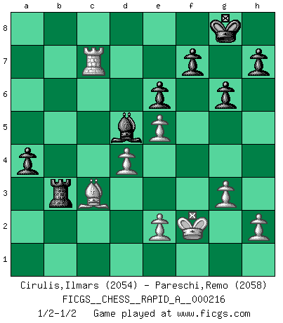 Last move : 1/2-1/2 2018 July 15 14:14:35 [Event "FICGS__CHESS__RAPID_A__000216"] [Site "FICGS"] [Date "2018.05.02"] [Round "1"] [White "Cirulis,Ilmars"] [Black "Pareschi,Remo"] [Result "1/2-1/2"] [WhiteElo "2054"] [BlackElo "2058"] 1.b4 Nf6 2.Nf3 g6 3.Bb2 Bg7 4.g3 d5 5.Bg2 Qd6 6.a3 a5 7.b5 Qb6 8.a4 Ne4 9.d4 c6 10.Na3 O-O 11.O-O Nd6 12.Ne5 Be6 13.Rb1 Rd8 14.c4 dxc4 15.Ba1 Qc7 16.Qc1 Bf5 17.Rb2 Be6 18.Rc2 Bf5 19.Rc3 cxb5 20.Nxb5 Nxb5 21.Rxc4 Qb6 22.Qb2 Nd7 23.Qxb5 Qxb5 24.axb5 Rab8 25.f4 Nb6 26.Rc7 Nd5 27.b6 Nxb6 28.Bxb7 Bxe5 29.fxe5 Rd7 30.Rxd7 Bxd7 31.Bg2 Nc4 32.Kf2 Rb3 33.Bd5 Be6 34.Bxc4 Bxc4 35.Rc1 Bd5 36.Rc7 e6 37.Bc3 a4 1/2-1/2 Comment by player 1 : Ilmars Cirulis : Heh, I forgot to check the draw offer box. :D Polish (Sokolsky) opening Kingside Castling by player Black (move 10) Kingside Castling by player White (move 11) This chess game ended in a draw. Follow this game move after move (download)Chess is a terrible game. If you have no center, your opponent has a freer position. If you do have a center, then you really have something to worry about ! (Siegbert Tarrasch) Rubinstein ist ein Turmendspiel, welches die Götter vor tausenden von Jahren begannen. (Savielly Grigorievitsch Tartakower) Sin errores no puede haber brillantez. (Emanuel Lasker) Le jeu d'échecs est comme rejeté hors du temps. (Antoine de Saint-Exupéry) Opportunities multiply as they are seized. (Sun Tzu)