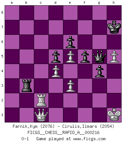 Last move : 0-1 2018 June 24 14:41:55 [Event "FICGS__CHESS__RAPID_A__000216"] [Site "FICGS"] [Date "2018.05.02"] [Round "1"] [White "Farnik,Kym"] [Black "Cirulis,Ilmars"] [Result "0-1"] [WhiteElo "2076"] [BlackElo "2054"] 1.d4 e6 2.c4 b6 3.Nc3 Bb7 4.a3 Nf6 5.Nf3 d5 6.Bg5 Be7 7.Qa4+ c6 8.e3 O-O 9.cxd5 cxd5 10.Bd3 Nc6 11.O-O Rc8 12.Ne5 h6 13.Bxf6 Bxf6 14.f4 Na5 15.Qd1 g6 16.Rc1 Bg7 17.Qg4 Qe7 18.Qe2 h5 19.Rf3 Nc4 20.Rh3 Nxe5 21.fxe5 f5 22.Rf3 Bh6 23.Rg3 Kg7 24.Re1 h4 25.Rf3 Bc6 26.Ba6 Rc7 27.h3 Kh8 28.Ref1 Qh7 29.Bd3 Rg8 30.Kh1 Rcg7 31.a4 Bg5 32.Bb5 Bxb5 33.Qxb5 Bh6 34.Qc6 Re7 35.R1f2 Rb8 36.Qb5 Rc7 37.a5 Qe7 38.axb6 Rxb6 39.Qd3 Rb4 40.Qa6 Qd7 41.g4 hxg3 42.Rxg3 g5 43.R3g2 Rb6 44.Qe2 Qe8 45.Qf3 a5 46.Rc2 Rbc6 47.Rc1 a4 48.Ra1 Rh7 49.Nxa4 g4 50.Qg3 R6c7 51.Rh2 Ra7 52.b3 Qg8 53.Rc1 Rag7 54.h4 Rf7 55.Rf1 Qf8 56.Nc3 Rb7 57.Ne2 Rxb3 58.Nf4 Qc8 59.Qf2 Rhb7 60.h5 Rb1 61.Rg2 Bxf4 62.Qxf4 Rxf1+ 63.Qxf1 Qd8 64.Qe1 Qg5 65.Rc2 Rb3 66.Qc1 Kh7 0-1 Queen's pawn : Keres defense Kingside Castling by player Black (move 8) Kingside Castling by player White (move 11) Player Black won this chess game. Follow this game move after move (download)Fischer is an American Chess tragedy on par with Morphy and Pillsbury. (Mig Greengard) Was ist der Unterschied zwischen einem Strassenarbeiter und einem Schachspieler? --Der Schachspieler bewegt sich ab und zu. (Anonymous) Entre mas años cumplo, mas valoro los Peones. (Keres) Un journaliste : 'Vous préférez avoir une dame de plus sur l'échiquier ou au lit ?' Boris Spassky : 'Ca dépend de la position.' Without enthusiasm, virtue functions not at all, and vice only poorly. (Mignon McLaughlin, The Neurotic's Notebook, 1960)