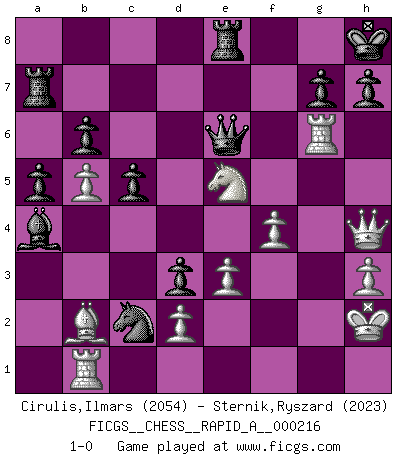 Last move : 1-0 2018 June 12 0:7:12 [Event "FICGS__CHESS__RAPID_A__000216"] [Site "FICGS"] [Date "2018.05.02"] [Round "1"] [White "Cirulis,Ilmars"] [Black "Sternik,Ryszard"] [Result "1-0"] [WhiteElo "2054"] [BlackElo "2023"] 1.b4 e5 2.a3 d5 3.e3 Nf6 4.Bb2 Bd6 5.c4 c6 6.Nf3 e4 7.Nd4 dxc4 8.Nc3 O-O 9.Bxc4 Nbd7 10.Be2 a5 11.b5 c5 12.Nf5 Ne5 13.Nxd6 Qxd6 14.Qc2 Rd8 15.Rd1 Nd3+ 16.Bxd3 exd3 17.Qa4 b6 18.Qh4 Bb7 19.f3 Qe6 20.Rc1 Ne8 21.Nd1 Bd5 22.O-O Bb3 23.Nf2 Nd6 24.a4 Nf5 25.Qf4 Ne7 26.Ra1 Nd5 27.Qh4 Nb4 28.f4 f5 29.g4 Rf8 30.h3 Nc2 31.Rab1 Bxa4 32.gxf5 Qxf5 33.Kh2 Ra7 34.Rg1 Qe6 35.Ng4 Kh8 36.Ne5 Re8 37.Rg6 1-0 Polish (Sokolsky) opening Kingside Castling by player Black (move 8) Kingside Castling by player White (move 22) Player White won this chess game. Follow this game move after move (download)The King is a fighting piece. Use it ! (Wilhelm Steinitz) Schach ist die gewalttätigste aller Sportarten. (Garry Kasparov) La vida es como el Ajedrez, con lucha, competición y eventos buenos y malos. (Benjamin Franklin) Les Echecs représentent une sphère d'idées créatrices basée sur la volonté des deux protagonistes. (Smyslov) Luck is the residue of design. (John Milton)