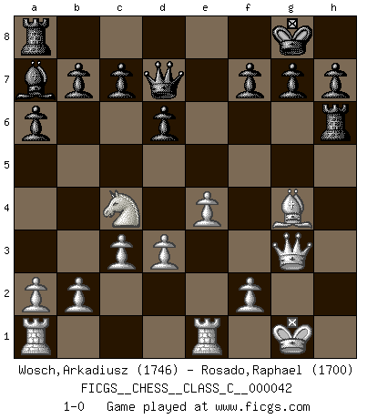 Last move : 1-0 2007 December 12 8:49:24 [Event "FICGS__CHESS__CLASS_C__000042"] [Site "FICGS"] [Date "2007.05.06"] [Round "1"] [White "Wosch,Arkadiusz"] [Black "Rosado,Raphael"] [Result "1-0"] [WhiteElo "1746"] [BlackElo "1700"] 1.e4 e5 2.Nf3 Nc6 3.Bc4 Bc5 4.c3 Nf6 5.d3 a6 6.O-O d6 7.Bb3 Ba7 8.Nbd2 O-O 9.Nc4 Ne7 10.Bg5 Ng6 11.Nh4 Nf4 12.Bxf4 exf4 13.Nf3 Re8 14.Qd2 Nh5 15.Rfe1 Bg4 16.Bd1 Qd7 17.h3 Bxh3 18.Nh2 Bxg2 19.Bxh5 Bh3 20.Qxf4 Re6 21.Qg3 Rh6 22.Ng4 Bxg4 23.Bxg4 1-0 This chess game has been lost on time (started : 2007.05.06 21:4:0) Giuoco Piano Kingside Castling by player White (move 6) Kingside Castling by player Black (move 8) Player White won this chess game. Follow this game move after move (download)Fischer is the strongest player in the world. In fact, the strongest player who ever lived. (Larry Evans) Im Schach nämlich geht es darum, daß Ich des Gegners klein zu kriegen, sein Ego zu zerbrechen und zu zermahlen, seine Selbstachtung zu zertreten und zu verscharren und seine ganze mißachtenswerte sogenannte Persönlichkeit ein für alle Mal tot zu hacken und zu zerstampfen und dadurch die menschliche Gesellschaft von einer stinkenden Pestbeule zu befreien. Es ist ein königliches Spiel. (Robert James Fischer) ¿Porque tengo que perder ante este idiota?. (Aron Nimzovich) Je fais ceci parce que dans cinquante coups j'obtiendrai cela; je m'appelle Mikhail Moisevitch Botvinnik. (Botvinnik) Dave, my mind is going. I can feel it. (HAL 9000 in 2001, a space odyssey)