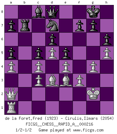 Last move : 1/2-1/2 2018 July 18 4:43:32 [Event "FICGS__CHESS__RAPID_A__000216"] [Site "FICGS"] [Date "2018.05.02"] [Round "1"] [White "de la Foret,Fred"] [Black "Cirulis,Ilmars"] [Result "1/2-1/2"] [WhiteElo "1923"] [BlackElo "2054"] 1.d4 e6 2.c4 b6 3.e4 Bb7 4.Nc3 Bb4 5.f3 Bxc3+ 6.bxc3 d6 7.Bd3 Qh4+ 8.g3 Qe7 9.Ne2 Nf6 10.O-O c5 11.Be3 O-O 12.Nc1 Nc6 13.Nb3 Rac8 14.Re1 Ba6 15.Qd2 Rc7 16.a3 Rfc8 17.Rac1 h6 18.Kg2 Nd7 19.Qe2 Na5 20.Nxa5 bxa5 21.Kg1 e5 22.d5 Rb7 23.Ra1 Rcb8 24.Ra2 Rb3 25.a4 Qf6 26.Kg2 Bc8 27.Bc1 Nf8 28.Bc2 R3b7 29.Rg1 Qg6 30.Re1 Qh5 31.h4 Qg6 32.Rh1 Re7 33.Qd3 Nd7 34.Qe2 Rb6 35.Bd3 Nf8 36.Rb2 Rxb2 37.Qxb2 Rb7 38.Qc2 Qf6 39.h5 Nd7 40.g4 Qd8 41.Bd2 Nb6 42.Qa2 Rb8 43.Rb1 Nd7 44.Rd1 Rb7 45.Be3 Nf6 46.Ra1 Nd7 1/2-1/2 Queen's pawn : Keres defense Kingside Castling by player White (move 10) Kingside Castling by player Black (move 11) This chess game ended in a draw. Follow this game move after move (download)Chess is a fighting game which is purely intellectual and includes chance. (Richard Reti) Das Spiel gibt uns die Genugtuung, die das Leben uns versagt. (Emanuel Lasker) Muchos jugadores de Ajedrez se sorprendían cuando después de la partida, Fischer explicaba con calma: 'Yo ya había analizado esta posibilidad' en una posición en la cual yo creía que no era posible de prever desde la apertura. (Mikhail Tal) Psychologiquement, tu dois avoir confiance en toi même, mais cette confiance doit être basée sur des faits. (Robert Fischer) In every real man a child is hidden that wants to play. (Friedrich Nietzsche)