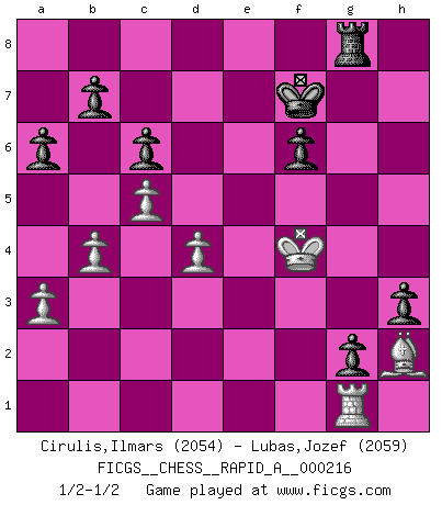 Last move : 1/2-1/2 2018 May 30 20:57:12 [Event "FICGS__CHESS__RAPID_A__000216"] [Site "FICGS"] [Date "2018.05.02"] [Round "1"] [White "Cirulis,Ilmars"] [Black "Lubas,Jozef"] [Result "1/2-1/2"] [WhiteElo "2054"] [BlackElo "2059"] 1.b4 e5 2.a3 d5 3.Bb2 Bd6 4.Nf3 Nd7 5.e3 Ngf6 6.d4 e4 7.Nfd2 c6 8.c4 O-O 9.Nc3 Re8 10.Be2 Nf8 11.g4 h6 12.h4 Ne6 13.Rg1 g5 14.Rh1 Bd7 15.Qb3 Nxd4 16.exd4 e3 17.fxe3 Bg3+ 18.Kd1 Nxg4 19.e4 Nf2+ 20.Kc2 dxe4 21.Rhg1 Bxh4 22.Nd1 e3 23.Nxe3 Qe7 24.Bg4 Nxg4 25.Nxg4 h5 26.Ne5 Bf5+ 27.Kc1 g4 28.c5 Rad8 29.Bc3 Bg5 30.Qc4 Qc7 31.Re1 Be6 32.Qd3 f6 33.Nec4 Bxc4 34.Qxc4+ Qf7 35.Kc2 Bxd2 36.Qxf7+ Kxf7 37.Rxe8 Rxe8 38.Bxd2 g3 39.Rg1 h4 40.Kd3 Rg8 41.Bf4 g2 42.Ke3 h3 43.Bh2 a6 44.Kf4 1/2-1/2 Polish (Sokolsky) opening Kingside Castling by player Black (move 8) This chess game ended in a draw. Follow this game move after move (download)Fischer is the strongest player in the world. In fact, the strongest player who ever lived. (Larry Evans) Gegen einen Schachcomputer zu verlieren ist wie Löcher in den Strümpfen zuhaben. Es ist nicht peinlich, solange man der einzige ist der es weiß. (Anonymous) ¿Porque tengo que perder ante este idiota?. (Aron Nimzovich) Je fais ceci parce que dans cinquante coups j'obtiendrai cela; je m'appelle Mikhail Moisevitch Botvinnik. (Botvinnik) Whoever said the pen is mightier than the sword obviously never encountered automatic weapons. (US General Douglas MacArthur)