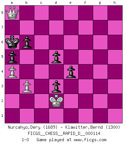 Last move : 1-0 2018 July 17 1:25:52 [Event "FICGS__CHESS__RAPID_D__000114"] [Site "FICGS"] [Date "2018.05.02"] [Round "1"] [White "Nurcahyo,Dery"] [Black "Klawitter,Bernd"] [Result "1-0"] [WhiteElo "1689"] [BlackElo "1300"] 1.e4 c6 2.c3 d5 3.e5 Bf5 4.d4 e6 5.Be3 Qb6 6.b3 h6 7.Nf3 a5 8.a4 Nd7 9.Nbd2 Qc7 10.h3 O-O-O 11.Nh4 Bh7 12.Nhf3 f6 13.exf6 gxf6 14.g3 Bd6 15.Rg1 Ne7 16.Be2 h5 17.Nh4 Kb8 18.Bxh5 Bc2 19.Qxc2 Rxh5 20.Ndf3 f5 21.Kf1 Rdh8 22.c4 f4 23.c5 fxe3 24.Ng6 Nxg6 25.cxd6 Qxd6 26.Qxg6 exf2 27.Kxf2 Rf5 28.h4 Rhf8 29.Raf1 Rxf3+ 30.Kg2 Rxf1 31.Rxf1 Rxf1 32.Kxf1 Ka7 33.h5 Qf8+ 34.Ke2 Qf6 35.Qxf6 Nxf6 36.h6 b6 37.Kf3 c5 38.g4 cxd4 39.g5 Nh7 40.g6 Nf6 41.h7 Nxh7 42.gxh7 e5 43.h8Q e4+ 44.Ke2 d3+ 45.Kd2 Ka6 46.Qa8+ 1-0 Caro-Kann defense Queenside Castling by player Black (move 10) 10 pieces endgame at move 42 : White KPPP , Black KPPPPP WHITE : King + 3 Pawns BLACK : King + 5 Pawns Promotion Queen by player White (move 43) Player White won this chess game. Follow this game move after move (download)I have never in my life played the French Defence, which is the dullest of all openings. (Wilhelm Steinitz) Gott hat gewollt, dass ich Champion werde. (Surab Azmajparaschvili) Antes de los Finales, los dioses han colocado el Juego Medio. (Siegbert Tarrasch) On entre au jeu d'Echecs comme on entre en Religion. Pour le joueur d'Echecs, la partie d'Echecs c'est l'office, la messe, le défilé du 1er Mai, le dépôt de gerbe au Monument aux Morts. C'est un drame sacré. (Michel Roos) Treat your password like your toothbrush. Don't let anybody else use it, and get a new one every six months. (Clifford Stoll)