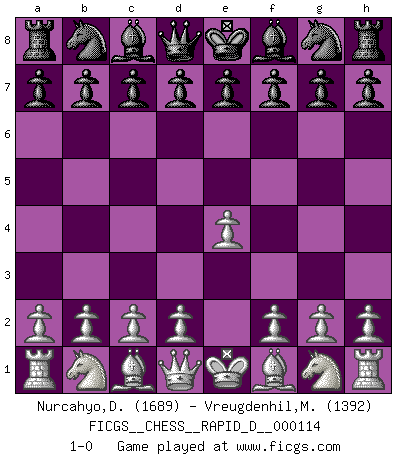 Last move : 1-0 2018 June 4 1:2:54 [Event "FICGS__CHESS__RAPID_D__000114"] [Site "FICGS"] [Date "2018.05.02"] [Round "1"] [White "Nurcahyo,Dery"] [Black "Vreugdenhil,Maarten"] [Result "1-0"] [WhiteElo "1689"] [BlackElo "1392"] 1.e4 1-0 This chess game has been lost on time (started : 2018.05.02 1:21:24) King's pawn Opening Player White won this chess game. Follow this game move after move (download)You sit at the board and suddenly your heart leaps. Your hand trembles to pick up the piece and move it. But what Chess teaches you is that you must sit there calmly and think about whether it's really a good idea and whether there are other better ideas. (Stanley Kubrick) Jede Eröffnung ist gut genug um gespielt zu werden, wenn nur ihr Ruf schlecht genug ist. (Savielly Grigorievitsch Tartakower) Hay dos clases de hombres: aquellos que se conforman en dejarse llevar por las circunstancias y que juegan barajas y aquellos decididos a controlar las circunstancias y que juegan al Ajedrez. (Mortimer Collins) Je ne suis pas le dernier à jouer lâchement des coups douteux pendant le zeïtnot de l'adversaire pour l'achever: en effet les coups qui font le plus peur sont ceux que l'on ne comprend pas. Je me fais souvent peur quand je joue. (Un professeur anonyme) Your best chance to get a Royal Flush in a casino is in the bathroom. (Anonymous)