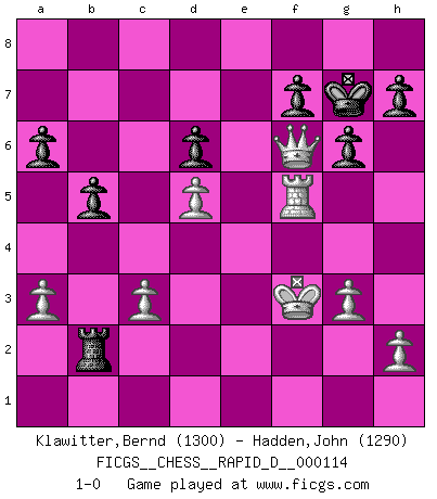 Last move : 1-0 2018 July 21 19:59:11 [Event "FICGS__CHESS__RAPID_D__000114"] [Site "FICGS"] [Date "2018.05.02"] [Round "1"] [White "Klawitter,Bernd"] [Black "Hadden,John"] [Result "1-0"] [WhiteElo "1300"] [BlackElo "1290"] 1.d4 d5 2.Bf4 Nf6 3.e3 Nc6 4.c3 Bf5 5.Bd3 Bxd3 6.Qxd3 e6 7.f3 Bd6 8.Bxd6 cxd6 9.Nd2 O-O 10.Ne2 e5 11.O-O a6 12.Qc2 b5 13.a3 Re8 14.Kh1 e4 15.fxe4 dxe4 16.Rxf6 Qxf6 17.Rf1 Qh6 18.Nf4 Rad8 19.d5 Ne7 20.Nxe4 Nc8 21.Rf3 g6 22.Nf6+ Kf8 23.Nxe8 Rxe8 24.Qd3 Nb6 25.Qd4 Nd7 26.Qh8+ Ke7 27.Qd4 Ne5 28.Rh3 Qg7 29.Qa7+ Kf8 30.Qc7 Ng4 31.Rf3 Nxe3 32.Ne6+ Kg8 33.Nxg7 Nf5 34.g3 Re7 35.Qd8+ Kxg7 36.Rxf5 Re1+ 37.Kg2 Re2+ 38.Kf3 Rxb2 39.Qf6+ 1-0 Queen's pawn, Mason variation Kingside Castling by player Black (move 9) Kingside Castling by player White (move 11) Player White won this chess game. Follow this game move after move (download)Fischer sacrificed virtually everything most of us weakies (to use his term) value, respect, and cherish, for the sake of an artful, often beautiful board game, for the ambivalent privilege of being its greatest master. (Paul Kollar) Es gibt keine einzige Frau, der ich nicht einen Springer vorgeben könnte und trotzdem gewänne. (Robert James Fischer) El juego de Damas es para vagabundos. (Paul Morphy) La vie est comme un jeu d'échecs : nous esquissons un plan, mais celui-ci est tributaire de ce que daignent faire l'adversaire aux échecs et le destin dans la vie. (Arthur Schopenhauer) We need strong personalities and only one world champion to attract sponsors. (Anatoly Karpov)