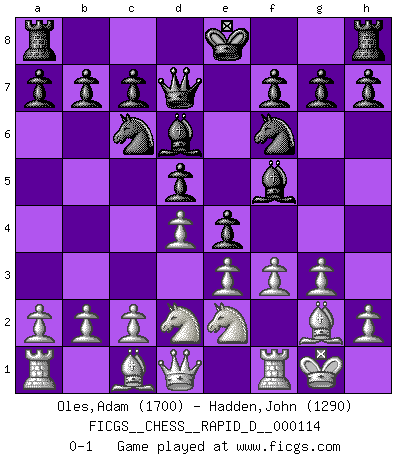 Last move : 0-1 2018 June 18 3:11:0 [Event "FICGS__CHESS__RAPID_D__000114"] [Site "FICGS"] [Date "2018.05.02"] [Round "1"] [White "Oles,Adam"] [Black "Hadden,John"] [Result "0-1"] [WhiteElo "1700"] [BlackElo "1290"] 1.d4 d5 2.e3 Nc6 3.g3 Nf6 4.Bg2 Bf5 5.Nd2 e5 6.Ne2 e4 7.f3 Bd6 8.O-O Qd7 0-1 This chess game has been lost on time (started : 2018.05.02 1:21:24) Queen's pawn game Kingside Castling by player White (move 8) Player Black won this chess game. Follow this game move after move (download)Botvinnik tried to take the mystery out of Chess, always relating it to situations in ordinary life. He used to call Chess a typical inexact problem similar to those which people are always having to solve in everyday life. (Garry Kasparov) Über Kasparov: Es ist offensichtlich, daß er in einem totalitären Staat aufwuchs und deshalb zu diktatorischen Zügen neigt. (Viktor Kortschnoi) La enorme capacidad mental, en la que sin ella no puede un jugador de Ajedrez existir, es demasiado requerida por el Ajedrez al grado de que nunca podrá liberar su mente de este juego. (Albert Einstein) Assurément je connaissais par expérience le mystérieux attrait de ce jeu royal, le seul entre tous les jeux inventés par les hommes qui échappe souverainement à la tyrannie du hasard, le seul où l'on ne doive sa victoire qu'à son intelligence ou plutôt à une certaine forme d'intelligence. Mais n'est-ce pas déjà le limiter injurieusement que d'appeler les échecs un jeu ? N'est-ce pas une science, un art ou quelque chose qui, comme le cercueil de Mahomet entre ciel et terre, est suspendu entre l'un et l'autre, et qui réunit un nombre incroyable de contraires ? [...] C'est une pensée qui ne mène à rien, une mathématique qui n'établit rien, un art qui ne laisse pas d'uvre, une architecture sans matière; et il l'a prouvé néanmoins qu'il était plus durable, à sa manière, que les livres ou que tout autre monument, ce jeu unique qui appartient à tous les peuples et à tous les temps, et dont personne ne sait quel dieu en fit don à la terre pour tuer l'ennui, pour aiguiser l'esprit et stimuler l'âme. Où commence-t-il, où finit-il ? (Stefan Zweig) I find your interest interesting. (Gregory House, House M.D.)