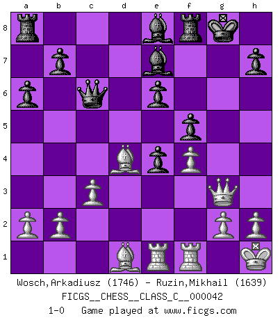 Last move : 1-0 2007 September 11 5:56:16 [Event "FICGS__CHESS__CLASS_C__000042"] [Site "FICGS"] [Date "2007.05.06"] [Round "1"] [White "Wosch,Arkadiusz"] [Black "Ruzin,Mikhail"] [Result "1-0"] [WhiteElo "1746"] [BlackElo "1639"] 1.e4 c5 2.Nf3 d6 3.d4 cxd4 4.Nxd4 Nf6 5.Nc3 e6 6.Be2 Be7 7.O-O a6 8.f4 Qc7 9.Be3 Bd7 10.Qe1 Nc6 11.Kh1 O-O 12.Qg3 d5 13.e5 Nxd4 14.Bxd4 Ne4 15.Nxe4 dxe4 16.Qe3 Qc6 17.c3 f5 18.exf6 gxf6 19.Rae1 Be8 20.Bd1 f5 21.Qg3+ 1-0 Sicilian : Scheveningen, 6.Be2 Kingside Castling by player White (move 7) Kingside Castling by player Black (move 11) Player White won this chess game. Follow this game move after move (download)We cannot resist the fascination of sacrifice, since a passion for sacrifices is part of a Chessplayer's nature. (Rudolf Spielman) Kritik überlasse ich den Spießern. Ich zeige nichts, wofür ich mich schämen muss. (Alexandra Kosteniuk) El Ajedrez es una manera fabulosa para que los niños aprendan a autovalorarse y a autoestimarse. (Saudin Robovic) Je crois qu'il existe des manières très spécifiques de jouer efficacement contre une machine. Evidemment, nous n'avons aucune chance en technique pure, parce que l'ordinateur calcule de manière parfaite. Mais lorsque nous faisons appel à notre cerveau, en utilisant l'intuition et la compréhension, alors nous restons beaucoup plus forts. (Anatoli Karpov) Pushing plastic is for the many, pushing virtual pieces is for the fewer, pushing wood is for the very few. (Normajean Yates)