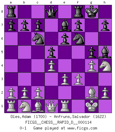 Last move : 0-1 2018 June 13 14:44:4 [Event "FICGS__CHESS__RAPID_D__000114"] [Site "FICGS"] [Date "2018.05.02"] [Round "1"] [White "Oles,Adam"] [Black "Anfruns,Salvador"] [Result "0-1"] [WhiteElo "1700"] [BlackElo "1622"] 1.d4 Nf6 2.e3 d5 3.g3 Nc6 4.Bg2 Bf5 5.Nf3 e6 6.O-O Be7 7.Re1 O-O 8.Nh4 Bg4 9.f3 Bh5 10.g4 g5 0-1 This chess game has been lost on time (started : 2018.05.02 1:21:24) Queen's pawn game Kingside Castling by player White (move 6) Kingside Castling by player Black (move 7) Player Black won this chess game. Follow this game move after move (download)No Chess Grandmaster is normal; they only differ in the extent of their madness. (Viktor Korchnoi) Kostenjuk hat keinen Sexappeal. (Loek van Wely) Bobby Fischer es el jugador de Ajedrez mas grande que jamás haya existido. (Ken Smith) On croit qu'il y a plus de mauvais joueurs que de bons joueurs, c'est faux : Il y a autant de joueurs qui gagnent que de joueurs qui perdent. (Philippe Geluck) If you lose the game you should win the analysis! (Proverb)