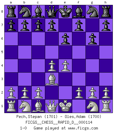 Last move : 1-0 2018 June 22 3:46:23 [Event "FICGS__CHESS__RAPID_D__000114"] [Site "FICGS"] [Date "2018.05.02"] [Round "1"] [White "Pech,Stepan"] [Black "Oles,Adam"] [Result "1-0"] [WhiteElo "1701"] [BlackElo "1700"] 1.e4 e6 2.d4 g6 3.Bd3 1-0 This chess game has been lost on time (started : 2018.05.02 1:21:24) French defense Player White won this chess game. Follow this game move after move (download)All my games are real. (Bobby Fischer) Ein Springer auf f6 gegen die eigene Rochadestellung ist schlimmer als ein rostiger Nagel im Knie. (Efim Bogoljubov) El Ajedrez es una guerra en un tablero. El objetivo es aplastar la mente del oponente. (Bobby Fischer) Les échecs, c'est l'imagination. (David Bronstein) Methinks King Thibault should dub Marius Zubac a knight of the square board... I mean table, henceforth addressing him as Sir Marius, and bestow on him a suitable land from the kingdom of FICGS & marry him off to a worthy, fair maiden, lest he slice our heads with his mighty sword in his wrath. (Dinesh De Silva)