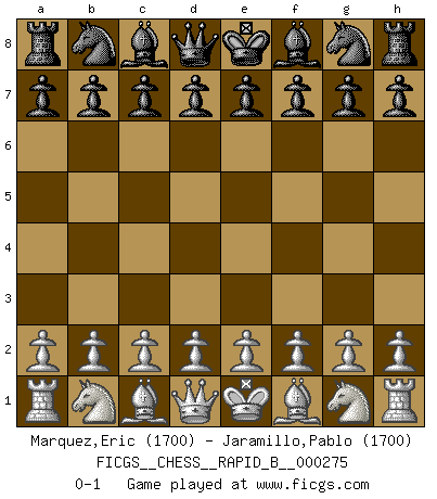 Last move : 0-1 2018 June 1 12:40:23 [Event "FICGS__CHESS__RAPID_B__000275"] [Site "FICGS"] [Date "2018.05.02"] [Round "1"] [White "Marquez,Eric"] [Black "Jaramillo,Pablo"] [Result "0-1"] [WhiteElo "1700"] [BlackElo "1700"] 0-1 This chess game has been lost on time (started : 2018.05.02 3:46:0) Player Black won this chess game. Follow this game move after move (download)As one by one I mowed them down, my superiority soon became apparent. (Jose Capablanca) Sitze auf Deine Hände. (Siegbert Tarrasch) La esencia del Ajedrez es pensar acerca de lo que el Ajedrez es. (David Bronstein) Le succès, c'est être capable d'aller d'échec en échec sans perdre son enthousiasme. (Winston Churchill) Wisdom doesn't necessarily come with age. Sometimes age just shows up all by itself. (Tom Wilson)