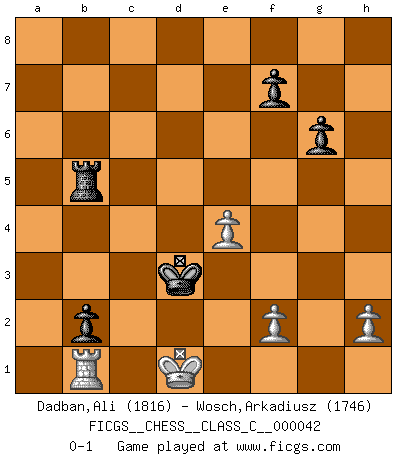 Last move : 0-1 2008 February 3 21:57:0 [Event "FICGS__CHESS__CLASS_C__000042"] [Site "FICGS"] [Date "2007.05.06"] [Round "1"] [White "Dadban,Ali"] [Black "Wosch,Arkadiusz"] [Result "0-1"] [WhiteElo "1816"] [BlackElo "1746"] 1.Nf3 Nf6 2.c4 e6 3.g3 d5 4.Bg2 Be7 5.O-O O-O 6.d4 dxc4 7.Qc2 a6 8.Qxc4 b5 9.Qc2 Bb7 10.Bd2 Be4 11.Qc1 Bb7 12.Rd1 Qc8 13.Nc3 Rd8 14.Qc2 b4 15.Na4 Be4 16.Qc1 Nbd7 17.Nc5 Nxc5 18.dxc5 a5 19.Ne5 Bxg2 20.Kxg2 Rd5 21.Nd3 e5 22.Be3 e4 23.Nf4 Rxd1 24.Qxd1 Qf5 25.Rc1 g5 26.Nh3 Nd5 27.Bd4 g4 28.Nf4 Nxf4+ 29.gxf4 Qxf4 30.Be3 Qf5 31.Qa4 Bf6 32.Qc6 Rc8 33.Rc4 Bxb2 34.Rxe4 Qg6 35.Qxg6+ hxg6 36.Rxg4 Rb8 37.Bf4 Rb5 38.Bxc7 Rxc5 39.Bb6 Rb5 40.Bd4 Bxd4 41.Rxd4 Kg7 42.e3 Kf6 43.Rd7 a4 44.Ra7 b3 45.axb3 axb3 46.Ra1 b2 47.Rb1 Ke5 48.Kf3 Kd5 49.Ke2 Kc4 50.e4 Kc3 51.Kd1 Kd3 0-1 Reti Opening Kingside Castling by player White (move 5) Kingside Castling by player Black (move 5) 10 pieces endgame at move 45 : White KRPPP , Black KRPPP WHITE : King + 1 Rook 3 Pawns BLACK : King + 1 Rook 3 Pawns Player Black won this chess game. Follow this game move after move (download)The laws of Chess do not permit a free choice: you have to move whether you like it or not. (Emanuel Lasker) Nur ein wirklich starker Spieler weiß wie schwach er spielt. (Savielly Grigorievitsch Tartakower) Hay dos clases de hombres: aquellos que se conforman en dejarse llevar por las circunstancias y que juegan barajas y aquellos decididos a controlar las circunstancias y que juegan al Ajedrez. (Mortimer Collins) Soyez une menace à chaque fois que vous vous asseyez pour jouer. (Ken Smith) Chess is as much a mystery as women. (Purdy)