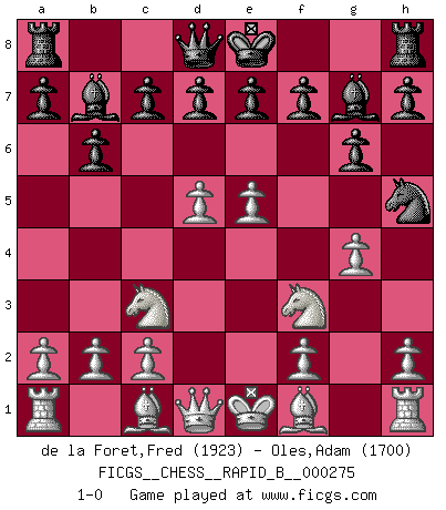 Last move : 1-0 2018 June 23 3:52:0 [Event "FICGS__CHESS__RAPID_B__000275"] [Site "FICGS"] [Date "2018.05.02"] [Round "1"] [White "de la Foret,Fred"] [Black "Oles,Adam"] [Result "1-0"] [WhiteElo "1923"] [BlackElo "1700"] 1.e4 Nc6 2.Nf3 b6 3.d4 g6 4.Nc3 Bb7 5.d5 Ne5 6.Nxe5 Bg7 7.Nf3 Nf6 8.e5 Nh5 9.g4 1-0 This chess game has been lost on time (started : 2018.05.02 3:46:0) KP : Nimzovich defense Player White won this chess game. Follow this game move after move (download)I like to say that Bobby Fischer was the greatest player ever. But what made Fischer a genius was his ability to blend an American freshness and pragmatism with Russian ideas about strategy. (Bruce Pandolfini) Gott hat gewollt, dass ich Champion werde. (Surab Azmajparaschvili) Aquellos que dicen que entienden al Ajedrez, no entienden nada. (Robert Hubner) Il s'avisa de me proposer d'apprendre les échecs qu'il jouait un peu... me voilà forcené des échecs. J'achète un échiquier, je m'enferme dans ma chambre, j'y passe des jours et des nuits à vouloir apprendre par cur toutes les parties. (Jean-Jacques Rousseau, Confessions) A government big enough to give you everything you want is strong enough to take everything you have. (Thomas Jefferson)