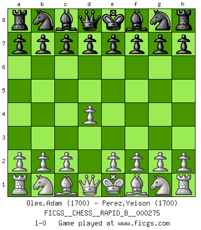 Last move : 1-0 2018 June 1 12:40:23 [Event "FICGS__CHESS__RAPID_B__000275"] [Site "FICGS"] [Date "2018.05.02"] [Round "1"] [White "Oles,Adam"] [Black "Perez,Yeison"] [Result "1-0"] [WhiteElo "1700"] [BlackElo "1700"] 1.d4 1-0 This chess game has been lost on time (started : 2018.05.02 3:46:0) Queen's pawn Player White won this chess game. Follow this game move after move (download)In complicated positions, Bobby Fischer hardly had to be afraid of anybody. (Paul Keres) Kritik überlasse ich den Spießern. Ich zeige nichts, wofür ich mich schämen muss. (Alexandra Kosteniuk) Si un gobernante no entiende al Ajedrez, ¿como puede governar él un reinado?. (El Rey Khusros II) Aux échecs, les retours au sommet sont rares : les dommages psychologiques consécutifs à une défaite sont trop sévères. (Daily Telegraph) Internal peace cannot coexist with external war. (Don Groves)