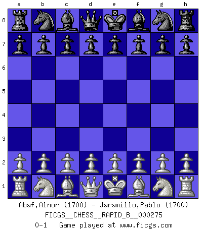 Last move : 0-1 2018 June 1 12:40:23 [Event "FICGS__CHESS__RAPID_B__000275"] [Site "FICGS"] [Date "2018.05.02"] [Round "1"] [White "Abaf,Alnor"] [Black "Jaramillo,Pablo"] [Result "0-1"] [WhiteElo "1700"] [BlackElo "1700"] 0-1 This chess game has been lost on time (started : 2018.05.02 3:46:0) Player Black won this chess game. Follow this game move after move (download)That's what Chess is all about. One day you give your opponent a lesson, the next day he gives you one. (Bobby Fischer) Die Auseinandersetzung mit Karpow war politisch geprägt. Er stand für das kommunistische System, wurde von dessen Repräsentanten gehätschelt. Ich war der Oppositionelle. Jeder Schachweltmeister spiegelt auch die gesellschaftlichen Verhältnisse wider. Kramnik steht für die Börsen-Generation des Neuen Markts, ideologiefrei, zahlenfixiert. (Garry Kasparov) El jugador táctico debe saber que hacer cuando algo se debe de hacer. El estratégico debe saber que hacer cuando nada se debe de hacer. (Savielly Tartakover) Les Echecs sont affaire de jugement sensible. Savoir quand frapper et quand esquiver. (Fischer) The modern world has divided itself into Conservatives and Progressives. The business of Progressives is to go on making mistakes. The business of the Conservatives is to prevent the mistakes from being corrected. (G.K. Chesterton)