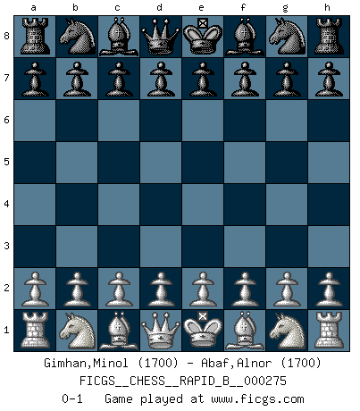 Last move : 0-1 2018 June 1 12:40:23 [Event "FICGS__CHESS__RAPID_B__000275"] [Site "FICGS"] [Date "2018.05.02"] [Round "1"] [White "Gimhan,Minol"] [Black "Abaf,Alnor"] [Result "0-1"] [WhiteElo "1700"] [BlackElo "1700"] 0-1 This chess game has been lost on time (started : 2018.05.02 3:46:0) Player Black won this chess game. Follow this game move after move (download)A chess genius has died; a loss for humanity. (Viktor Kortchnoi, about Bobby Fischer's death) In Buenos Aires ist es nicht mein vorrangiges Ziel ein starkes Turnier zu organisieren, sondern ein Turnier für Gentlemen. Ich würde nie Kamsky einladen. Ich mag keine Probleme. (Miguel Najdorf) Si tu oponente no puede hacer nada activo, entonces no apures la posición; En vez de eso, dejalo estar sentado ahí, sufriendo y rogandote por un empate. (Jeremy Silman) Les échecs, c'est la lutte contre l'erreur. (Johannes Zukertort) If you are good, you will be assigned all the work. If you are really good, you will get out of it. (Dan Rotaru)