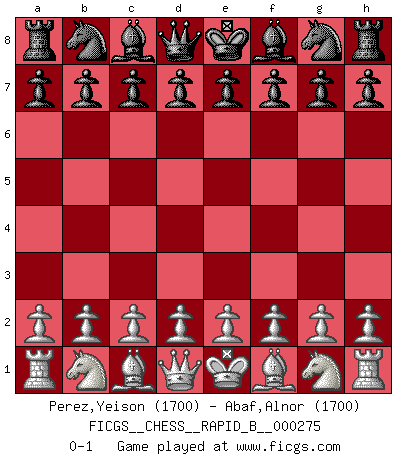 Last move : 0-1 2018 June 1 12:40:23 [Event "FICGS__CHESS__RAPID_B__000275"] [Site "FICGS"] [Date "2018.05.02"] [Round "1"] [White "Perez,Yeison"] [Black "Abaf,Alnor"] [Result "0-1"] [WhiteElo "1700"] [BlackElo "1700"] 0-1 This chess game has been lost on time (started : 2018.05.02 3:46:0) Player Black won this chess game. Follow this game move after move (download)Don't even mention losing to me. I can't stand to think of it. (Bobby Fischer) Offensichtlich kennt Kasparow nichts anderes als Schach, und ich könnte 500 weitere Spieler dieser Sorte benennen. (Judith Polgar) Un Peón pasado es un criminal, quién debe ser mantenido bajo candado y llave. Leves medidas, tales como vigilancia policiaca, no son suficientes. (Aaron Nimzovich) Le génie consiste à savoir transgresser les règles au moment opportun. (Teichmann) The various flowers seem good to different people. (Chinese proverb)