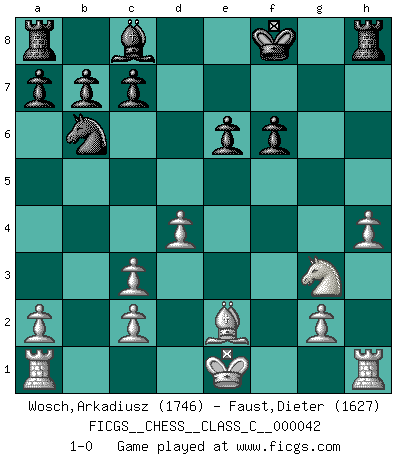 Last move : 1-0 2007 August 11 7:40:11 [Event "FICGS__CHESS__CLASS_C__000042"] [Site "FICGS"] [Date "2007.05.06"] [Round "1"] [White "Wosch,Arkadiusz"] [Black "Faust,Dieter"] [Result "1-0"] [WhiteElo "1746"] [BlackElo "1627"] 1.e4 e6 2.d4 d5 3.Nc3 Nf6 4.Bg5 Bb4 5.e5 h6 6.Bd2 Bxc3 7.bxc3 Ne4 8.Qg4 Kf8 9.Qf4 Qg5 10.Qxe4 dxe4 11.Bxg5 hxg5 12.f3 exf3 13.Nxf3 g4 14.Nd2 f6 15.Be2 g3 16.exf6 gxf6 17.h4 Nd7 18.Nf1 Nb6 19.Nxg3 1-0 French : MacCutcheon, Lasker variation Player White won this chess game. Follow this game move after move (download)It is always better to sacrifice your opponent's men. (Savielly Tartakower) Aljechin war kein Nazi. Er war ein Opportunist. Ein schrecklicher Mann. Er liebte Geld über alles und würde für Geld ein Jude, ein Katolik oder ein Protestant werden. (Miguel Najdorf) La maestría del Ajedrez consiste esencialmente en analizar posiciónes de Ajedrez con precisión. (Mikhail Botvinnik) Comme les marins qui ont mille raisons différentes d'aller en mer, les joueurs d'échecs en ont tout autant avant de s'installer devant une table et jouer... (Vincent Bertignac, philosophe) Good decisions come from experience, and experience comes from bad decisions. (Anonymous)