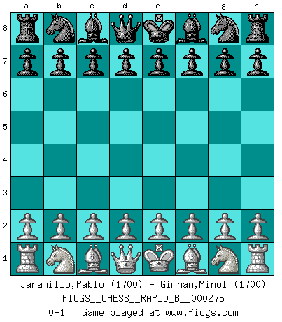 Last move : 0-1 2018 June 1 12:40:23 [Event "FICGS__CHESS__RAPID_B__000275"] [Site "FICGS"] [Date "2018.05.02"] [Round "1"] [White "Jaramillo,Pablo"] [Black "Gimhan,Minol"] [Result "0-1"] [WhiteElo "1700"] [BlackElo "1700"] 0-1 This chess game has been lost on time (started : 2018.05.02 3:46:0) Player Black won this chess game. Follow this game move after move (download)In Chess, just as in life, today's bliss may be tomorrow's poison. (Assaic) Verschiedene, sehr schätzbare und im Laufe des Lebens nützliche Eigenschaften des Geistes können durch das Schachspiel erworben und gekräftigt werden, so dass sie zu Gewohnheiten werden, die uns nie im Stich lassen. (Benjamin Franklin) Nos gusta pensar. (Gary Kasparov) Même un GMI sait rarement calculer sur plus de cinq coups une attaque à sacrifices. (Rudolf Spielmann) A good book on your shelf is a friend that turns its back on you and remains a friend. (Author unknown)