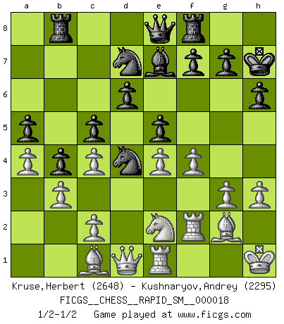 Last move : 1/2-1/2 2018 June 17 6:48:50 [Event "FICGS__CHESS__RAPID_SM__000018"] [Site "FICGS"] [Date "2018.05.02"] [Round "1"] [White "Kruse,Herbert"] [Black "Kushnaryov,Andrey"] [Result "1/2-1/2"] [WhiteElo "2648"] [BlackElo "2295"] 1.e4 c5 2.Nc3 a6 3.Nge2 Nf6 4.g3 d6 5.Bg2 e5 6.O-O Be7 7.d3 b5 8.f4 O-O 9.Qd2 h6 10.Nd1 Nc6 11.b3 a5 12.a4 b4 13.Bb2 Nd4 14.Ne3 Ng4 15.Nc4 Be6 16.h3 Bxc4 17.dxc4 Nf6 18.Rae1 Rb8 19.Qd1 Nd7 20.Kh1 Kh7 21.Rf2 Qe8 22.Bc1 1/2-1/2 Sicilian : Closed Kingside Castling by player White (move 6) Kingside Castling by player Black (move 8) This chess game ended in a draw. Follow this game move after move (download)Look at Garry Kasparov. After he loses, invariably he wins the next game. He just kills the next guy. That's something that we have to learn to be able to do. (Maurice Ashley) Wenn Du absolut nicht mehr weißt, was Du tun sollst, dann ist es Zeit für Panik. (John van der Wiel) Hoy en día, si tu no eres un Gran Maestro a los 14 años, es mejor que lo olvides. (Anand Viswanathan) Horreur, mais aussi harmonie suprême : qu'y avait-il en effet au monde en dehors des échecs ? Le brouillard, l'inconnu, le non-être... (Vladimir Nabokov) There's no money in correspondence chess. (John Knudsen)