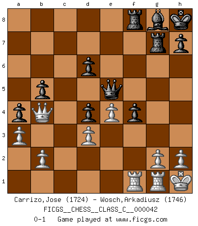Last move : 0-1 2007 December 26 8:36:8 [Event "FICGS__CHESS__CLASS_C__000042"] [Site "FICGS"] [Date "2007.05.06"] [Round "1"] [White "Carrizo,Jose"] [Black "Wosch,Arkadiusz"] [Result "0-1"] [WhiteElo "1724"] [BlackElo "1746"] 1.e4 c5 2.Nc3 Nc6 3.f4 g6 4.Nf3 Bg7 5.Bc4 d6 6.O-O e6 7.d3 Nge7 8.Qe1 O-O 9.f5 gxf5 10.Qh4 fxe4 11.dxe4 a6 12.Qh5 Qe8 13.Bd3 f5 14.Qh3 Nb4 15.Bg5 Nxd3 16.cxd3 b5 17.Qg3 e5 18.Bh6 Qg6 19.Bg5 f4 20.Qf2 Nc6 21.Nd5 Bg4 22.Bh4 Kh8 23.Kh1 a5 24.Nc3 Rab8 25.Rac1 a4 26.Rg1 Bf6 27.Bxf6+ Rxf6 28.Nd5 R6f8 29.Ra1 Be6 30.Nc7 Bg8 31.a3 Rb7 32.Na6 Nd4 33.Nxd4 exd4 34.Rac1 Qg5 35.Rcf1 Qe5 36.Qd2 Ra7 37.Nb4 cxb4 38.Qxb4 Rg7 0-1 Sicilian : Grand Prix attack Kingside Castling by player White (move 6) Kingside Castling by player Black (move 8) Player Black won this chess game. Follow this game move after move (download)Without error there can be no brilliancy. (Emanuel Lasker) Ich weiss nicht was Gott gegen mich auf 1.e4 antworten würde. (Robert James Fischer) El Ajedrez es realmente noventa y nueve por ciento calculación. (Soltis) Si le désir cupide (et stupide) de gagner est une inépuisable source de souffrance, une combinaison brillante sur l'échiquier est une découverte : le coquelicot qui s'épanouit lorsque apparaît la Voie Lactée. (Arrabal) The large trees attract high winds. (Chinese proverb)