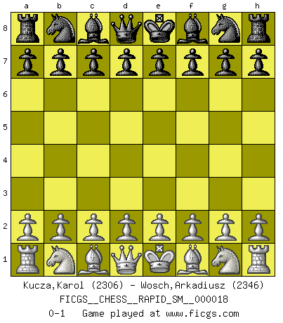 Last move : 0-1 2018 June 2 0:45:32 [Event "FICGS__CHESS__RAPID_SM__000018"] [Site "FICGS"] [Date "2018.05.02"] [Round "1"] [White "Kucza,Karol"] [Black "Wosch,Arkadiusz"] [Result "0-1"] [WhiteElo "2306"] [BlackElo "2346"] 0-1 This chess game has been lost on time (started : 2018.05.02 17:44:26) Player Black won this chess game. Follow this game move after move (download)Suddenly it was obvious to me in my analysis I had missed what Fischer had found with the greatest of ease at the board. (Mikhail Botvinnik) Matt entspricht nicht immer den Tatsachen. (Savielly Grigorievitsch Tartakower) Si tu oponente no puede hacer nada activo, entonces no apures la posición; En vez de eso, dejalo estar sentado ahí, sufriendo y rogandote por un empate. (Jeremy Silman) La tactique est l'élément le plus important du milieu de jeu. (Siegbert Tarrasch) Excelling at chess has long been considered a symbol of more general intelligence. That is an incorrect assumption in my view, as pleasant as it might be. But for the purposes of argument and investigation, chess is, in Russkin-Gutman's words, 'an unparalleled laboratory, since both the learning process and the degree of ability obtained can be objectified and quantified, providing an excellent comparative framework on which to use rigorous analytical techniques.' (The Chess Master and the Computer, by Garry Kasparov - 2010)