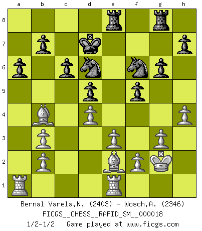 Last move : 1/2-1/2 2018 July 17 3:41:8 [Event "FICGS__CHESS__RAPID_SM__000018"] [Site "FICGS"] [Date "2018.05.02"] [Round "1"] [White "Bernal Varela,Nelson"] [Black "Wosch,Arkadiusz"] [Result "1/2-1/2"] [WhiteElo "2403"] [BlackElo "2346"] 1.Nf3 Nf6 2.g3 d5 3.Bg2 c6 4.O-O Bg4 5.h3 Bh5 6.c4 e6 7.d4 Nbd7 8.cxd5 exd5 9.Nh4 Be7 10.Qb3 Qb6 11.Nf5 Qxb3 12.axb3 Bf8 13.Bf4 Bg6 14.Nd6+ Bxd6 15.Bxd6 Nf8 16.Bb4 Bxb1 17.Rfxb1 Ne6 18.e3 a6 19.h4 Nh5 20.Bf1 f5 21.Be2 Nf6 22.Kg2 Kd7 23.Rh1 Rae8 24.Rhe1 Nc7 25.Ba5 Nb5 26.Bb4 g6 27.Bd3 Nd6 28.Be2 Rhg8 1/2-1/2 Reti Opening Kingside Castling by player White (move 4) This chess game ended in a draw. Follow this game move after move (download)You must take your opponent into a deep dark forest where 2+2=5, and the path leading out is only wide enough for one. (Mikhail Tal) Das Schach hält seine Meister in eigenen Banden, Fesseln; auf vielerlei Weise formt es ihren Geist, so dass die innere Freiheit selbst des Stärksten beeinflusst wird. (Albert Einstein) Si pudieramos observar el interior de la cabeza de un jugador de Ajedrez, encontraríamos ahí un mundo lleno de sentimientos, imágenes, ideas, emoción y pasión. (Alfred Binet) Il n'y a pas de prix trop élevé au scalp de l'ennemi. (Koblentz) You know what they say : You lie down with the Devil, you wake up in Hell. (Horatio Caine, C.S.I. Miami)