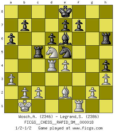 Last move : 1/2-1/2 2018 July 14 21:1:7 [Event "FICGS__CHESS__RAPID_SM__000018"] [Site "FICGS"] [Date "2018.05.02"] [Round "1"] [White "Wosch,Arkadiusz"] [Black "Legrand,Stephane"] [Result "1/2-1/2"] [WhiteElo "2346"] [BlackElo "2386"] 1.e4 c5 2.Nf3 d6 3.d4 cxd4 4.Nxd4 Nf6 5.Nc3 a6 6.Be3 Ng4 7.Bg5 h6 8.Bh4 g5 9.Bg3 Bg7 10.h3 Ne5 11.Qd2 Nbc6 12.O-O-O Nxd4 13.Qxd4 Be6 14.Nd5 Rc8 15.f4 gxf4 16.Bxf4 Qa5 17.a3 Qc5 18.Qxc5 Rxc5 19.Kb1 h5 20.Be2 Nc4 21.Bc1 Bh6 22.Rd4 Ne5 23.Bxh6 Rxh6 24.Rf1 h4 1/2-1/2 Sicilian : Najdorf, Byrne (English) attack Queenside Castling by player White (move 12) This chess game ended in a draw. Follow this game move after move (download)The King is a fighting piece. Use it ! (Wilhelm Steinitz) Charakterschwächen offenbaren sich normalerweise während einer Schachpartie. (Garry Kasparov) Me siento como si fuera una pieza en una partida de Ajedrez, cuando mi oponente me indica: esa pieza no puede ser movida. (Soren Kierkegaard) Le génie consiste à savoir transgresser les règles au moment opportun. (Teichmann) The arrogant army will lose certainly the battle. (Chinese proverb)
