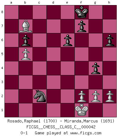 Last move : 0-1 2007 September 8 1:29:57 [Event "FICGS__CHESS__CLASS_C__000042"] [Site "FICGS"] [Date "2007.05.06"] [Round "1"] [White "Rosado,Raphael"] [Black "Miranda,Marcus"] [Result "0-1"] [WhiteElo "1700"] [BlackElo "1691"] 1.d4 Nf6 2.Nf3 e6 3.Bg5 c5 4.e3 Be7 5.Nbd2 b6 6.Bd3 Bb7 7.O-O h6 8.Bh4 Nc6 9.c3 g5 10.Bg3 d6 11.e4 O-O 12.Re1 cxd4 13.cxd4 g4 14.e5 dxe5 15.Nxe5 Qxd4 16.Ba6 Rad8 17.Bxb7 Nxe5 18.Bxe5 Qxd2 19.Qb3 Nd7 20.Bc3 Qg5 21.Qc2 Nc5 22.Bc6 Bf6 23.Bxf6 Qxf6 24.Rad1 a5 25.a3 Rxd1 26.Rxd1 Rd8 27.b4 axb4 28.axb4 Na6 29.b5 Nb4 30.Qe2 Rd4 31.Re1 Qg5 32.Rd1 Qe5 33.Qf1 Qd6 34.Rc1 Rd2 35.Qc4 Rd1+ 36.Rxd1 Qxd1+ 37.Qf1 Qxf1+ 38.Kxf1 Kf8 39.Bb7 Nc2 0-1 Queen's pawn : Torre attack Kingside Castling by player White (move 7) Kingside Castling by player Black (move 11) Player Black won this chess game. Follow this game move after move (download)The passed pawn is a criminal, who should be kept under lock and key. Mild measures, such as police surveillance, are not sufficient. (Nimzovitch) Ich habe kein Problem mit Frauen, sondern nur mit dem Niveau ihres Schachspiels (Judith Polgar) El juego de Fischer siempre fue nítido, racional y brillante. Uno de los mejores por siempre. (Dave Regis) Shah mat. Le roi est mort. Cri de fierté d'un joueur venant de terrasser son adversaire, courtoisement, sans effusion de sang. There will be no order, only chaos. (Sol Robeson in Pi by Darren Aronofsky)