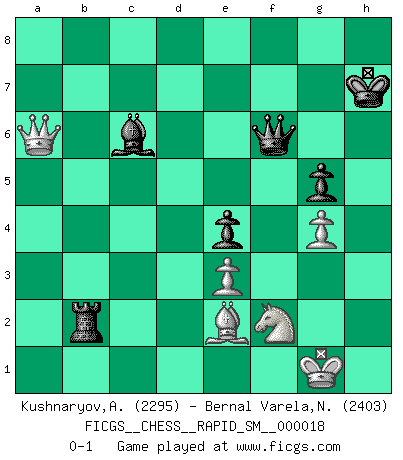 Last move : 0-1 2018 October 16 15:22:32 [Event "FICGS__CHESS__RAPID_SM__000018"] [Site "FICGS"] [Date "2018.05.02"] [Round "1"] [White "Kushnaryov,Andrey"] [Black "Bernal Varela,Nelson"] [Result "0-1"] [WhiteElo "2295"] [BlackElo "2403"] 1.Nf3 e6 2.c4 f5 3.g3 Nf6 4.Bg2 g6 5.b3 Bg7 6.Bb2 O-O 7.O-O b6 8.Ng5 c6 9.Nc3 Re8 10.Re1 Bb7 11.Rc1 Na6 12.d4 d5 13.e3 Qe7 14.Nh3 Rad8 15.Qe2 Nb8 16.Red1 Ba6 17.Nb1 Ne4 18.Qc2 Nd7 19.Nf4 Rc8 20.Nc3 Qf7 21.Bf1 Bb7 22.Nxe4 fxe4 23.Be2 Nf6 24.h4 h6 25.Nh3 Bf8 26.a4 Qg7 27.Kg2 g5 28.hxg5 hxg5 29.Rh1 Rc7 30.Rh2 Qg6 31.Rch1 Rh7 32.Ng1 Rxh2+ 33.Rxh2 Qf5 34.Qd1 Bc8 35.Bc3 Rd8 36.g4 Qg6 37.Rh1 dxc4 38.bxc4 e5 39.d5 Bd6 40.Qa1 Re8 41.Nh3 cxd5 42.Qd1 Kg7 43.Ng1 Bd7 44.a5 Rc8 45.axb6 axb6 46.Bb2 Rf8 47.cxd5 Ra8 48.Nh3 b5 49.Kg1 b4 50.Rh2 Ra5 51.f3 Rxd5 52.Qe1 exf3 53.Bxf3 e4 54.Be2 Bxh2+ 55.Kxh2 Kf7 56.Bxf6 Qxf6 57.Qxb4 Qe7 58.Qc3 Rc5 59.Qd4 Rc2 60.Kg1 Kg6 61.Bd1 Rc1 62.Qd2 Rb1 63.Kg2 Bb5 64.Nf2 Qf6 65.Qd5 Bc6 66.Qc4 Kg7 67.Kg1 Kh6 68.Qa6 Rb2 69.Be2 Kh7 0-1 Reti Opening Kingside Castling by player Black (move 6) Kingside Castling by player White (move 7) Player Black won this chess game. Follow this game move after move (download)The Pawns are the soul of the game. (Francois Andre Danican Philidor) Über Frauen: Chess is better. (Robert James Fischer) El muchacho (en ese entonces un niño de 12 años llamado Anatoly Karpov) no tiene ni idea de lo que es el Ajedrez y no hay futuro en absoluto para el en esta profesión. (Mikhail Botvinnik) Il (Jacob Murray) ne joue pas pour le bon coup, mais pour le meilleur. (Eloi Relange) Man is reluctant to give credit for intelligence to anyone, except his enemies. (Albert Einstein)