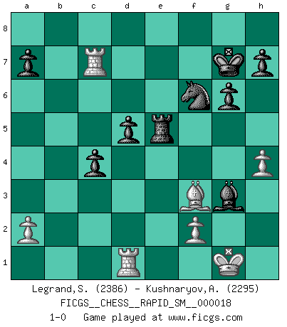 Last move : 1-0 2018 August 21 13:56:30 [Event "FICGS__CHESS__RAPID_SM__000018"] [Site "FICGS"] [Date "2018.05.02"] [Round "1"] [White "Legrand,Stephane"] [Black "Kushnaryov,Andrey"] [Result "1-0"] [WhiteElo "2386"] [BlackElo "2295"] 1.d4 Nf6 2.c4 e6 3.g3 c5 4.d5 exd5 5.cxd5 d6 6.Nc3 g6 7.Bg2 Bg7 8.Nf3 O-O 9.O-O Re8 10.Bf4 Ne4 11.Nxe4 Rxe4 12.Nd2 Rxf4 13.gxf4 Bxb2 14.Rb1 Bg7 15.e4 Nd7 16.Qf3 Bh6 17.Qg3 Qf6 18.e5 Qxf4 19.e6 Nf6 20.Nc4 fxe6 21.Nxd6 exd5 22.Nxc8 Rxc8 23.Rxb7 c4 24.Qh3 Re8 25.Qc3 Qe5 26.Qxe5 Rxe5 27.Rc7 Kf8 28.Rc6 Kf7 29.Rd1 Bf4 30.h4 Kg7 31.Bf3 Bg3 32.Rc7+ 1-0 Catalan Opening Kingside Castling by player Black (move 8) Kingside Castling by player White (move 9) Player White won this chess game. Follow this game move after move (download)The older I grow, the more I value pawns. (Paul Keres) Die starken Figuren des Gegners muss man abtauschen. (José Raúl Capablanca) El Ajedrez, como la música, como el amor, tiene el poder de hacer feliz a la gente. (Siegbert Tarrasch) Un millionnaire : 'Monsieur Steinitz ! Vous ne participez aux tournois que pour l'argent, alors que moi je n'y viens que pour l'honneur.' Steinitz : 'Chacun joue pour ce qu'il n'a pas'... You must have a dream in order to have it come true. (A.P.J. Kalam)