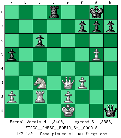 Last move : 1/2-1/2 2018 July 10 1:1:18 [Event "FICGS__CHESS__RAPID_SM__000018"] [Site "FICGS"] [Date "2018.05.02"] [Round "1"] [White "Bernal Varela,Nelson"] [Black "Legrand,Stephane"] [Result "1/2-1/2"] [WhiteElo "2403"] [BlackElo "2386"] 1.Nf3 Nf6 2.g3 c5 3.Bg2 Nc6 4.O-O e5 5.c4 d5 6.Qa4 Bd6 7.d4 cxd4 8.cxd5 Nxd5 9.Nxd4 exd4 10.Bxd5 Qb6 11.Rd1 O-O 12.Bxc6 bxc6 13.Qxd4 Bc5 14.Qf4 Be6 15.Nc3 Rad8 16.Be3 Bxe3 17.Qxe3 Qxb2 18.f3 Bf5 19.Kf2 Bc2 20.Rxd8 Rxd8 21.Re1 Qb4 22.Rc1 Qb2 23.g4 a5 24.g5 Qb8 25.Rxc2 Qxh2+ 26.Ke1 Qh1+ 27.Kf2 Qh2+ 28.Ke1 Qh1+ 1/2-1/2 Reti Opening Kingside Castling by player White (move 4) Kingside Castling by player Black (move 11) This chess game ended in a draw. Follow this game move after move (download)After black's reply to 1.e4 with 1..e5, leaves him always trying to get into the game. (Howard Staunton) Vom Schach wurde gesagt das Leben sei dafür nicht lange genug. Aber das ist der Fehler des Lebens, nicht des Schach'. (Irving Chernev) Una buena ofensiva y una buena defensa, comienzan ambas con un buen desarrollo. (Bruce A. Moon) La menace est plus forte que l'exécution. (Aaron Nimzovitch) Man is still the most extraordinary computer of all. (John F. Kennedy)