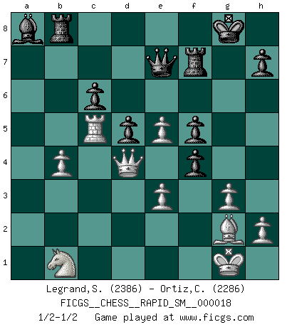 Last move : 1/2-1/2 2018 July 14 22:56:50 [Event "FICGS__CHESS__RAPID_SM__000018"] [Site "FICGS"] [Date "2018.05.02"] [Round "1"] [White "Legrand,Stephane"] [Black "Ortiz,Clodomiro"] [Result "1/2-1/2"] [WhiteElo "2386"] [BlackElo "2286"] 1.d4 Nf6 2.c4 e6 3.g3 d5 4.Bg2 Bb4+ 5.Nd2 O-O 6.Ngf3 b6 7.O-O Bb7 8.b3 Nbd7 9.Bb2 Rc8 10.Rc1 Qe7 11.e3 Ne4 12.Qe2 f5 13.Rc2 c6 14.Rfc1 Rcd8 15.cxd5 exd5 16.Nb1 Bd6 17.Ne1 g5 18.f4 Qe6 19.Nd3 Rde8 20.Ne5 Nxe5 21.dxe5 Bc5 22.Rxc5 Nxc5 23.Ba3 Rf7 24.Bxc5 bxc5 25.Rxc5 Qe7 26.b4 a5 27.a3 axb4 28.axb4 Rb8 29.Qd3 Ba8 30.Qd4 gxf4 1/2-1/2 Catalan : Closed Kingside Castling by player Black (move 5) Kingside Castling by player White (move 7) This chess game ended in a draw. Follow this game move after move (download)For surely of all the drugs in the world, Chess must be the most permanently pleasurable. (Assiac) Nur ein wirklich starker Spieler weiß wie schwach er spielt. (Savielly Grigorievitsch Tartakower) Es el objetivo de la escuela moderna no tratar cada posición de acuerdo a una regla general, sino de acuerdo al principio inherente en la posición. (Richard Reti) Plusieurs personnes se sont demandées comment Tal faisait pour gagner... En fait, c'est très simple ! Il met ses pièces au centre de l'échiquier et les sacrifie quelque part ! (David Bronstein) Memory... is the diary that we all carry with us. (Oscar Wilde, The Importance of Being Earnest)
