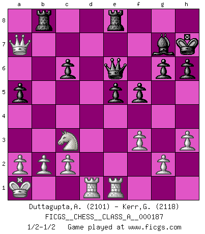 Last move : 1/2-1/2 2018 September 21 12:0:0 [Event "FICGS__CHESS__CLASS_A__000187"] [Site "FICGS"] [Date "2018.05.02"] [Round "1"] [White "Duttagupta,Aniruddha"] [Black "Kerr,Graham"] [Result "1/2-1/2"] [WhiteElo "2101"] [BlackElo "2118"] 1.e4 c5 2.Nf3 d6 3.d4 cxd4 4.Nxd4 Nf6 5.Nc3 g6 6.Be3 Bg7 7.f3 O-O 8.Qd2 Nc6 9.O-O-O d5 10.Qe1 e5 11.Nxc6 bxc6 12.exd5 Nxd5 13.Bc4 Be6 14.Kb1 a5 15.Ne4 f5 16.Ng5 Bc8 17.Qd2 h6 18.Ne4 Kh7 19.Nc3 Nxe3 20.Qxe3 Qf6 21.Bb3 Qe7 22.h3 Rb8 23.Rhe1 Re8 24.Ka1 Be6 25.Bxe6 Qxe6 26.Qa7 1/2-1/2 Sicilian : Dragon, Yugoslav attack, 7...O-O Kingside Castling by player Black (move 7) Queenside Castling by player White (move 9) This chess game ended in a draw. Follow this game move after move (download)Adequate compensation for a sacrifice is having a sound combination leading to a winning position; adequate compensation for a blunder is having your opponent snatch defeat from the jaws of victory. (Bruce A. Moon) Es liegt in der Natur, vernüftig zu denken und unlogisch zu handeln. (Anatole France) En la vida, como en el Ajedrez, los Peones propios obstruyen nuestro camino. La gran fortuna de un hombre, su comodidad, placer, hijos, libros, que deberían ayudarle a ganar, con mucha frecuencia lo ponen en Jaque Mate. (Charles Buxton) La tactique est l'élément le plus important du milieu de jeu. (Siegbert Tarrasch) What doesn't kill us makes us stronger. (Friedrich Nietzsche)