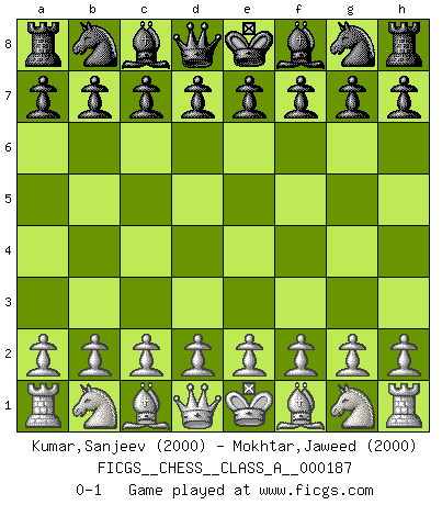 Last move : 0-1 2018 June 12 2:34:12 [Event "FICGS__CHESS__CLASS_A__000187"] [Site "FICGS"] [Date "2018.05.02"] [Round "1"] [White "Kumar,Sanjeev"] [Black "Mokhtar,Jaweed"] [Result "0-1"] [WhiteElo "2000"] [BlackElo "2000"] 0-1 This chess game has been lost on time (started : 2018.05.02 21:57:59) Player Black won this chess game. Follow this game move after move (download)I believe that Chess possesses a magic that is also a help in advanced age. A rheumatic knee is forgotten during a game of Chess and other events can seem quite unimportant in comparison with a catastrophe on the chessboard. (Vlastimil Hort) Ivan Sokolov treibt mich als Beifahrer an mit go Loeky go - . (Loek van Wely) Las leyes del Ajedrez no permiten una libre elección: tienes que mover quieras o no. (Emanuel Lasker) Les Echecs sont affaire de jugement sensible. Savoir quand frapper et quand esquiver. (Fischer) The best teachers teach from the heart, not from the book. (Author unknown)