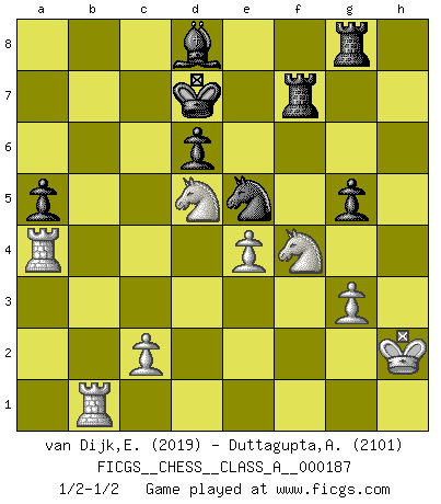 Last move : 1/2-1/2 2019 January 4 16:15:10 [Event "FICGS__CHESS__CLASS_A__000187"] [Site "FICGS"] [Date "2018.05.02"] [Round "1"] [White "van Dijk,Erik L."] [Black "Duttagupta,Aniruddha"] [Result "1/2-1/2"] [WhiteElo "2019"] [BlackElo "2101"] 1.e4 c5 2.Nf3 d6 3.d4 cxd4 4.Nxd4 Nf6 5.Nc3 a6 6.Bg5 e6 7.f4 Qb6 8.Qd3 Qxb2 9.Rb1 Qa3 10.f5 Qa5 11.Qc4 Nbd7 12.fxe6 Qxg5 13.exf7+ Ke7 14.Qe6+ Kd8 15.Qe8+ Nxe8 16.Ne6+ Ke7 17.fxe8Q+ Kxe8 18.Nxg5 Ra7 19.Nd5 Ne5 20.g3 Be7 21.Bh3 Bxh3 22.Nxh3 Bd8 23.O-O b5 24.Nhf4 Rf7 25.h4 Rg8 26.Kh2 Kd7 27.a4 bxa4 28.Rb4 a5 29.Rxa4 h6 30.Rb1 g5 31.hxg5 hxg5 1/2-1/2 Sicilian : Najdorf, 7...Qb6 Promotion Queen by player White (move 17) Kingside Castling by player White (move 23) This chess game ended in a draw. Follow this game move after move (download)When I asked Fischer why he had not played a certain move in our game, he replied: 'Well, you laughed when I wrote it down !' (Mikhail Tal) Wer sich die Fähigkeit anerziehen will im Schach selbstständig zu denken, der muß alles meiden, was leblos ist: ausgeklügelte Theorien, die sich auf sehr wenige Beispiele und eine Menge Hirngespinste stützen. (Emanuel Lasker) Los tropiezos estan todos ahí en el tablero, esperando que se cometan. (Savielly Tartakover) J'ai vu le vaincu d'Echecs jouer des années durant dans l'espoir de la fête de la victoire. Car tu es plus riche de ce qu'elle existe si même elle n'est point pour toi. Ainsi de la perle du fond des mers. (Antoine de Saint-Exupéry) The real danger is not that computers will begin to think like men, but that men will begin to think like computers. (Sydney J. Harris)