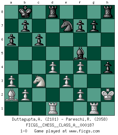 Last move : 1-0 2018 December 20 14:15:36 [Event "FICGS__CHESS__CLASS_A__000187"] [Site "FICGS"] [Date "2018.05.02"] [Round "1"] [White "Duttagupta,Aniruddha"] [Black "Pareschi,Remo"] [Result "1-0"] [WhiteElo "2101"] [BlackElo "2058"] 1.d4 d5 2.c4 e6 3.Nc3 Be7 4.cxd5 exd5 5.Bf4 Nf6 6.e3 Bf5 7.Qb3 Nc6 8.g4 Nxg4 9.Qxd5 Qxd5 10.Nxd5 Bb4+ 11.Nc3 O-O-O 12.Nge2 Rhe8 13.Bg2 Nf6 14.O-O Nh5 15.Bg3 Nxg3 16.hxg3 Kb8 17.a3 Bd6 18.Bd5 Bg6 19.Ba2 a6 20.Kg2 h5 21.Nf4 Bxf4 22.gxf4 Ne7 23.Rad1 h4 24.Rh1 Rh8 25.Kh3 c6 26.Rhg1 Bf5+ 27.Kh2 1-0 This chess game has been lost on time (started : 2018.05.02 21:57:59) QGD : Charousek (Petrosian) variation Queenside Castling by player Black (move 11) Kingside Castling by player White (move 14) Player White won this chess game. Follow this game move after move (download)Combinations have always been the most intriguing aspect of Chess. The masters look for them, the public applauds them, the critics praise them. It is because combinations are possible that Chess is more than a lifeless mathematical exercise. They are the poetry of the game; they are to Chess what melody is to music. They represent the triumph of mind over matter. (Reuben Fine) Schach ist wie eine schöne Frau, zu der wir ständig zurückkehren, gleichviel, wie oft sie uns zurückweist. (Anonymous) El arma más poderosa en el Ajedrez, es tener la próxima movida. (David Bronstein) Plusieurs personnes se sont demandées comment Tal faisait pour gagner... En fait, c'est très simple ! Il met ses pièces au centre de l'échiquier et les sacrifie quelque part ! (David Bronstein) Vladimir Ras-Putin is still alive... He is also a good actor, I saw him in the Lord of the Rings. (Rodolfo d'Ettorre)