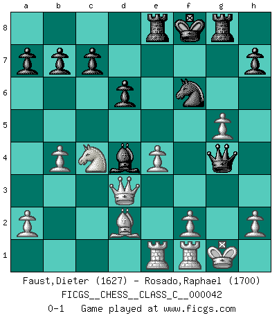 Last move : 0-1 2007 June 19 19:57:52 [Event "FICGS__CHESS__CLASS_C__000042"] [Site "FICGS"] [Date "2007.05.06"] [Round "1"] [White "Faust,Dieter"] [Black "Rosado,Raphael"] [Result "0-1"] [WhiteElo "1627"] [BlackElo "1700"] 1.e4 e5 2.Nf3 Nc6 3.Bc4 Bc5 4.d4 exd4 5.O-O d6 6.c3 Bg4 7.Qb3 Bxf3 8.Bxf7+ Kf8 9.gxf3 Ne5 10.cxd4 Bxd4 11.Bxg8 Rxg8 12.f4 Ng4 13.Qg3 Qd7 14.Nd2 Re8 15.Qd3 Bb6 16.Nc4 Bc5 17.Bd2 g5 18.fxg5 Nf6 19.b4 Bd4 20.Rae1 Qg4+ 0-1 Giuoco Piano Kingside Castling by player White (move 5) Player Black won this chess game. Follow this game move after move (download)What is the object of playing a gambit opening?... To acquire a reputation of being a dashing player at the cost of losing a game. (Siegbert Tarrasch) Schach ist gnadenlos. Du mußt bereit sein zu töten. (Nigel Short) Un jugador que es sorprendido, esta derrotado a medias. (Proverbio) Les pièces de l'échiquier étaient impitoyables. Elles le retenaient, elles l'absorbaient. Il y avait de l'horreur en cela, mais aussi une harmonie unique. Car, qu'y a-t-il dans le monde, à part les échecs ? (V. Nabokov) When you stop learning you start dying. (Scott Adams)