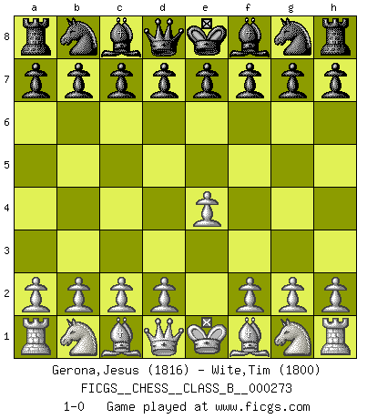 Last move : 1-0 2018 June 13 2:44:42 [Event "FICGS__CHESS__CLASS_B__000273"] [Site "FICGS"] [Date "2018.05.03"] [Round "1"] [White "Gerona,Jesus"] [Black "Wite,Tim"] [Result "1-0"] [WhiteElo "1816"] [BlackElo "1800"] 1.e4 1-0 This chess game has been lost on time (started : 2018.05.03 20:41:15) King's pawn Opening Player White won this chess game. Follow this game move after move (download)When I have White, I win because I am white; When I have Black, I win because I am Bogolyubov. (Bogolyubov) Schach ist Kampf, hauptsächlich jedoch gegen die eigenen Fehler. (Savielly Grigorievitsch Tartakower) Los Peones son el alma de una partida de Ajedrez. (Francois Andre Danican Philidor) C'est la seule position que je connaisse où les deux camps sont mals. Propos prêtés à V. Anand. To steal ideas from one person is plagiarism. To steal from many is research. (Unknown)