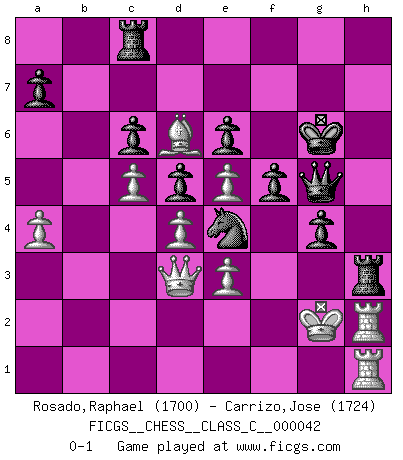 Last move : 0-1 2007 December 19 9:20:17 [Event "FICGS__CHESS__CLASS_C__000042"] [Site "FICGS"] [Date "2007.05.06"] [Round "1"] [White "Rosado,Raphael"] [Black "Carrizo,Jose"] [Result "0-1"] [WhiteElo "1700"] [BlackElo "1724"] 1.d4 d5 2.Nf3 c6 3.e3 Nf6 4.b3 Bf5 5.Bb2 e6 6.Be2 Nbd7 7.Nbd2 Be7 8.c4 h6 9.O-O O-O 10.a3 Ne4 11.Nxe4 Bxe4 12.Rc1 Bd6 13.Bd3 f5 14.Qe2 Qf6 15.Nd2 Qh4 16.f4 Nf6 17.Nf3 Qh5 18.Ne5 Bxd3 19.Qxd3 Bxe5 20.fxe5 Ne4 21.a4 Rac8 22.Ba3 Rfe8 23.Bd6 Kh7 24.c5 g5 25.b4 g4 26.g3 Qh3 27.Rc2 h5 28.b5 h4 29.bxc6 bxc6 30.Rg2 hxg3 31.hxg3 Kg6 32.Rh2 Qxg3+ 33.Rg2 Qh4 34.Rh2 Qg5 35.Kg2 Rh8 36.Rfh1 Rh3 0-1 Queen's pawn game Kingside Castling by player White (move 9) Kingside Castling by player Black (move 9) Player Black won this chess game. Follow this game move after move (download)Weak points or holes in the opponent's position must be occupied by pieces not Pawns. (Siegbert Tarrasch) Zu meiner Zeit war ein 20 jähriger ein junger Spieler, heute ist er ein Veteran. (Garry Kasparov) La caracteristica mas importante en la posición del Ajedrez es la actividad de las piezas. Esto es absolutamente fundamental en todas las fases del juego: Apertura, Juego Medio y especialmente Finales. La limitación primordial en la actividad de una pieza, es la estructuración de los Peones. (Michael Stean) On peut tirer plus d'utilité d'une partie perdue que de 100 parties gagnées. (Capablanca) Humor is by far the most significant activity of the human brain. (Edward De Bono)