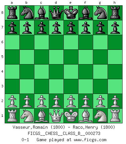 Last move : 0-1 2018 June 13 2:44:42 [Event "FICGS__CHESS__CLASS_B__000273"] [Site "FICGS"] [Date "2018.05.03"] [Round "1"] [White "Vasseur,Romain"] [Black "Raco,Henry"] [Result "0-1"] [WhiteElo "1800"] [BlackElo "1800"] 0-1 This chess game has been lost on time (started : 2018.05.03 20:41:15) Player Black won this chess game. Follow this game move after move (download)By the beauty of his games, the clarity of his play, and the brilliance of his ideas, Fischer made himself an artist of the same stature as Brahms, Rembrandt, and Shakespeare. (David Levy) Wie kann ich Remis annehmen? Ich weiß ja gar nicht, wie ich stehe! (Fritz Sämisch) Sin errores no puede haber brillantez. (Emanuel Lasker) Le joueur d'Echecs qui veut atteindre le top est obligé de développer son propre credo créatif. Alexeï Stepanovicth Souétine. Il est facile d'écrire des livres ! Ce qui est difficile, c'est de jouer ! (Alexeï Stepanovicth Souétine) Programming can only do so much before it becomes too much. (Don Groves)