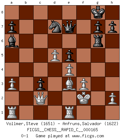 Last move : 0-1 2018 May 17 3:28:2 [Event "FICGS__CHESS__RAPID_C__000165"] [Site "FICGS"] [Date "2018.05.04"] [Round "1"] [White "Vollmer,Steve"] [Black "Anfruns,Salvador"] [Result "0-1"] [WhiteElo "1651"] [BlackElo "1622"] 1.d4 Nf6 2.c4 e6 3.Nc3 Bb4 4.f3 d5 5.a3 Bxc3+ 6.bxc3 c5 7.e3 O-O 8.Bd3 Qc7 9.Qb3 b5 10.Qxb5 cxd4 11.cxd4 Ba6 12.Qb1 dxc4 13.Be4 Nxe4 14.fxe4 c3 15.Qc2 Qc6 16.Nf3 Nd7 17.e5 f6 18.exf6 Rxf6 19.e4 Raf8 20.Kf2 Rg6 21.Re1 e5 22.d5 Qc5+ 23.Be3 Rxf3+ 24.gxf3 Qe7 0-1 Nimzo-Indian : Kmoch variation Kingside Castling by player Black (move 7) Player Black won this chess game. Follow this game move after move (download)Suddenly it was obvious to me in my analysis I had missed what Fischer had found with the greatest of ease at the board. (Mikhail Botvinnik) Es hat in meinem Leben Zeiten gegeben, in denen das Schachspiel, wenn nicht zum Lebenszweck, so doch zu einem regelrechten Lebensersatz geworden ist. Man fühlt sich in solchen Zeiten nicht so, als besäße man eine göttliche Gabe, sondern eher so, als sei man von ihr besessen. (Garry Kasparov) Si tu oponente te ofrece un empate, trata de averiguar porque piensa él que esta en una posición peor. (Nigel Short) Dieu déplace le joueur, et celui-ci la pièce. Quel Dieu derrière Dieu commence donc la trame ? Arturo Perez-Reverte (prix de littérature policière 1993). No, I am still playing. (Anatoly Karpov)