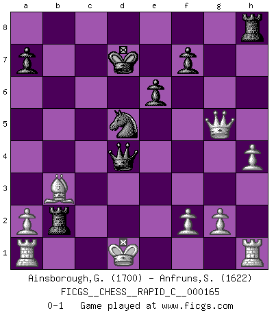 Last move : 0-1 2018 June 24 1:0:35 [Event "FICGS__CHESS__RAPID_C__000165"] [Site "FICGS"] [Date "2018.05.04"] [Round "1"] [White "Ainsborough,Gregory"] [Black "Anfruns,Salvador"] [Result "0-1"] [WhiteElo "1700"] [BlackElo "1622"] 1.d4 Nf6 2.Nf3 d5 3.c4 e6 4.Nc3 Bb4 5.Bg5 dxc4 6.e4 b5 7.e5 h6 8.Bh4 g5 9.Nxg5 hxg5 10.Bxg5 Nbd7 11.Qf3 Rb8 12.exf6 Bb7 13.Qf4 Bd6 14.Qe3 Nxf6 15.Nxb5 Be7 16.Qe5 Bd5 17.Nxc7+ Kd7 18.Nxd5 Nxd5 19.Bxe7 Qa5+ 20.Kd1 Kxe7 21.Qg5+ Kd7 22.h4 Rxb2 23.Bxc4 Qa4+ 24.Bb3 Qxd4+ 0-1 Queen's pawn game Player Black won this chess game. Follow this game move after move (download)The Pawns are the soul of the game. (Francois Andre Danican Philidor) Das Spiel gibt uns die Genugtuung, die das Leben uns versagt. (Emanuel Lasker) Por la belleza de sus partidas, la claridad de su juego y lo brillante de sus ideas, Fischer se creó el mismo como un artista de la misma estatura como Brahms, Rembrandt y Shakespeare. (David Levy) L'ordinateur a tué l'originalité. Il n'y a plus guère d'aventures sur l'échiquier. (Jacob Murray) Opportunities multiply as they are seized. (Sun Tzu)